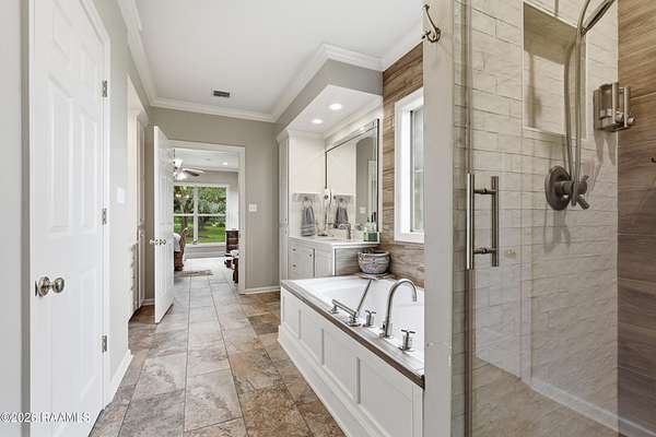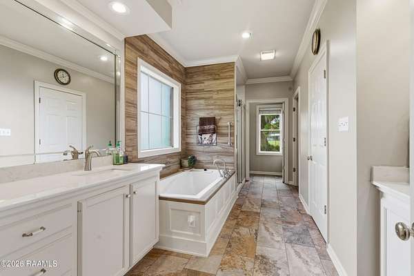 - Built-In Features, Built-Ins, Double Vanity, Dual Closets, Electric Dryer Con, Electric Stove Con, Electric Washer Con, Garden Tub, Granite Counters, Kitchen Island, Primary Bath, Separate Shower, Walk-In Closet(s)