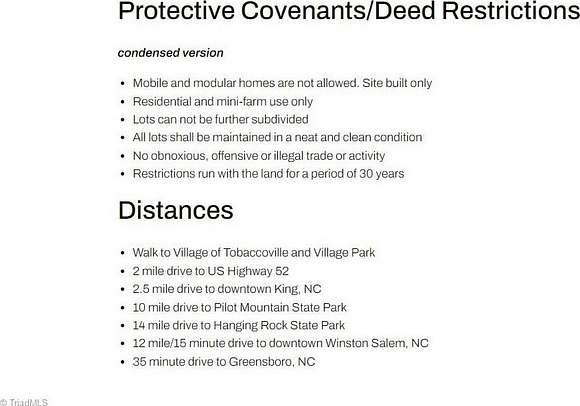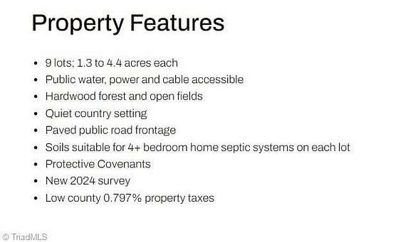 No deed restrictions and no minimum square footage requirements. Lot 1 offers 2.7 acres, situated just outside the city limits of Tobaccoville in Forsyth County, NC. Enjoy a brand new 615-foot private gravel driveway, built atop geofabric for durability. The future homesite is an open field surrounded by woods, offering exceptional privacy--tucked over 600 feet from the public road and completely out of sight. There's a small stream at the edge of the lot, and utility access is easy with nearby power and cable lines. Soils have already been evaluated and support a 4+ bedroom septic system. This property is within walking distance of the town park. For more details, including interactive maps and a video tour, visit the listing agent's website. Agent owned.