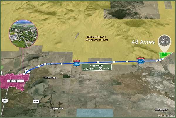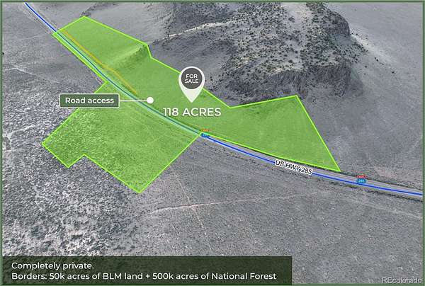 Opportunity to acquire over 119 acres across three contiguous tracts along Highway 285, just 4 minutes outside Saguache, Colorado. The property spans both sides of the highway and borders 50,000+ acres of BLM and National Forest land to the north and east, offering protected open space, long-term privacy, and direct access to public land.