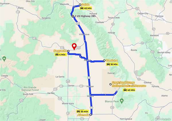 Conveniently located 4 minutes to Saguache, 30 minutes to Salida, 50 minutes to Great Sand Dunes National Park, and 1 hour to Monarch Ski Area.