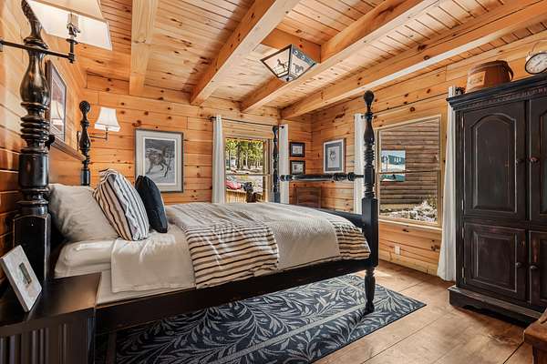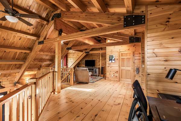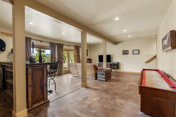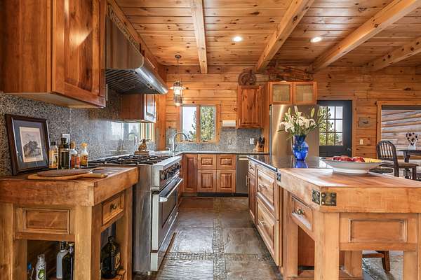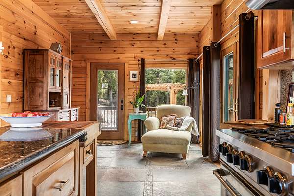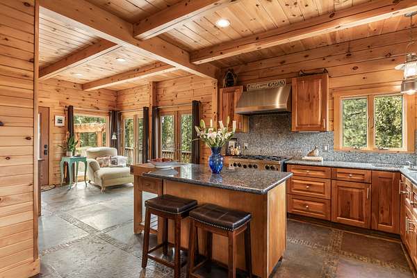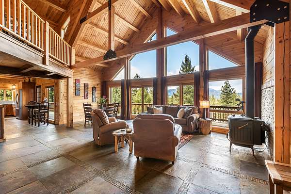Walking into the stunning 3,800-square-foot custom log home with a wrap-around deck, you're greeted with expansive mountain peak views from the floor-to-ceiling windows in the living room. The large kitchen features custom cabinets, stainless steel appliances, a dual gas range, and an island. With three bedrooms & 2.5 bathrooms, there's plenty of space for family and/or friends. On the ground floor, you'll discover an entertainer's delight with a wooden bar and plenty of space for entertaining, complete with a half-bath. Also, there is an acoustic paneled studio for musicians, aspiring musicians, or ripe to be transformed into a podcast/recording studio, fully functional office, or home theatre.