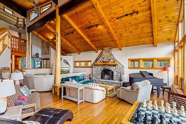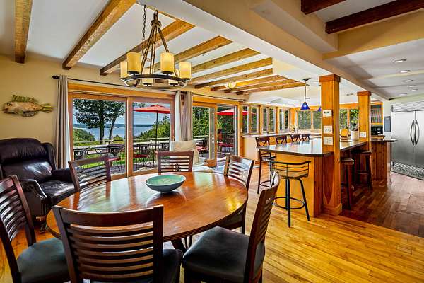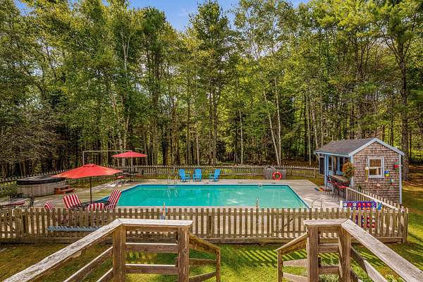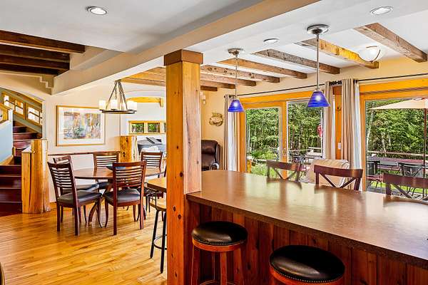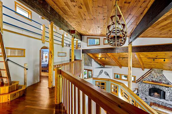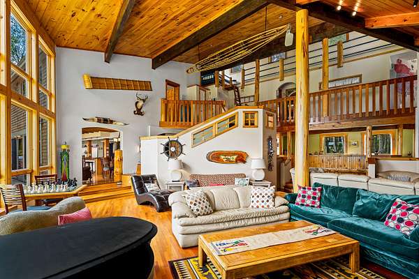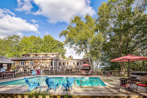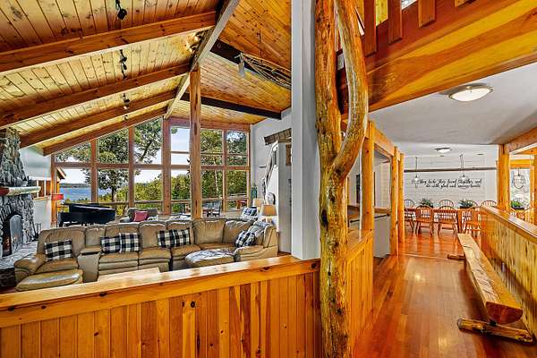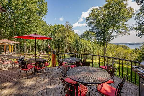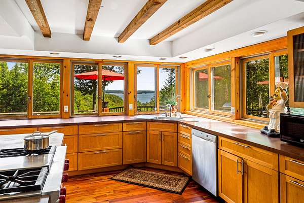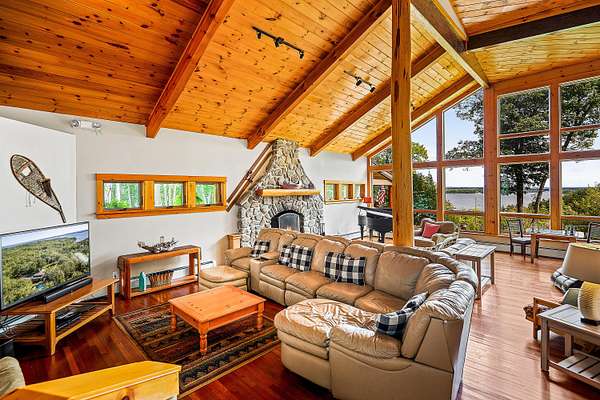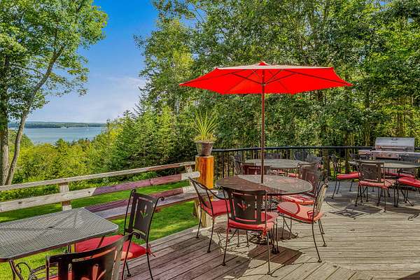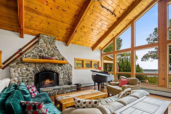 This exceptional private one-of-a-kind estate overlooking Penobscot Bay blends natural materials and custom architecture throughout. Massive tree trunk timbers and exposed supporting beams rise to meet curved archways, while custom cherry, rosewood, maple and oak flooring showcase the exquisite craftsmanship throughout this magnificent home. Floor to ceiling windows reaching 26 feet high and a granite fireplace, frame dazzling ocean views. The chef's dream kitchen, with a walk-in pantry, is perfect for entertaining, and opens to a wrap-around deck overlooking the bay. Your private compound awaits with family friendly resort style amenities such as an in-law apartment with kitchen, game room, in-ground heated swimming pool, hot tub, outdoor shower, manicured grounds, outdoor fire pit, two swing sets, tether ball court, sandbox, and putting green. With unparalleled views and an exceptional rental history this property is a rare investment opportunity which blends luxury, comfort and natural beauty.