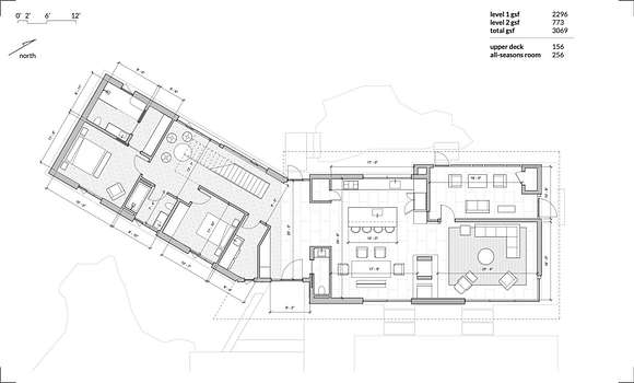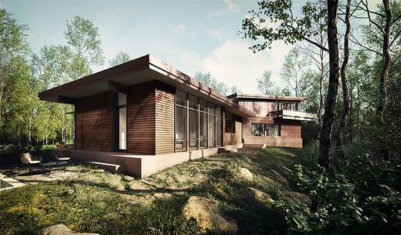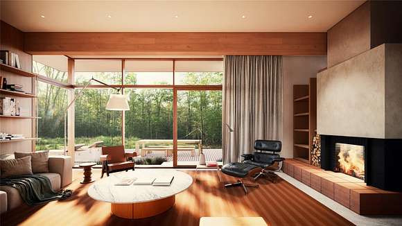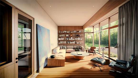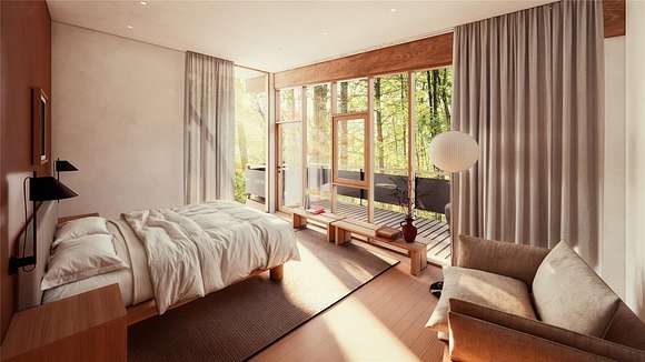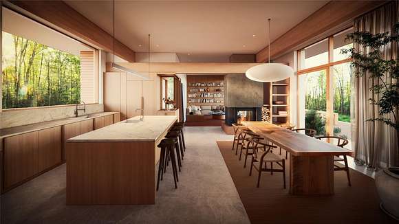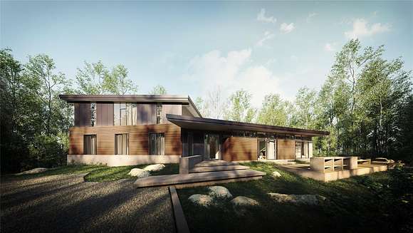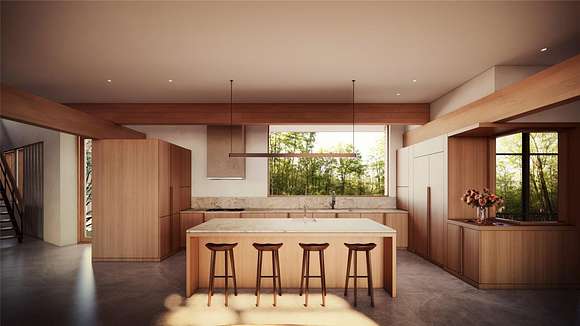 At the end of a bucolic country road, up a long driveway and perched atop a forested rise sits Honeycomb, one of four custom designed homes to be built at Beehive, a private and secluded four home enclave in Accord. Inspired by mid-century modern masterpieces, the design invokes simplicity in nature with light and air prioritized to seamlessly co-exist with the natural surroundings. The architecture is defined by a distinctive flat roof, reaching out into the landscape. Two asymmetric wings are offset to strategically capture natural light. The single level communal wing includes a chef's kitchen, a double-sided fireplace and an outdoor screened in porch. A two-level sleeping wing contains two bedrooms on the ground floor and a primary ensuite and flex space on the second floor. An expansive deck outfitted with an all-season kitchen and comfortable dining/lounge area, a screened-in room porch, a stargazing terrace and trails into the forest promote a robust outdoor life.