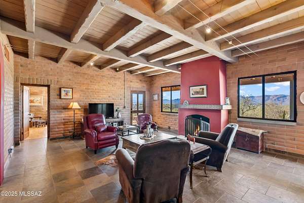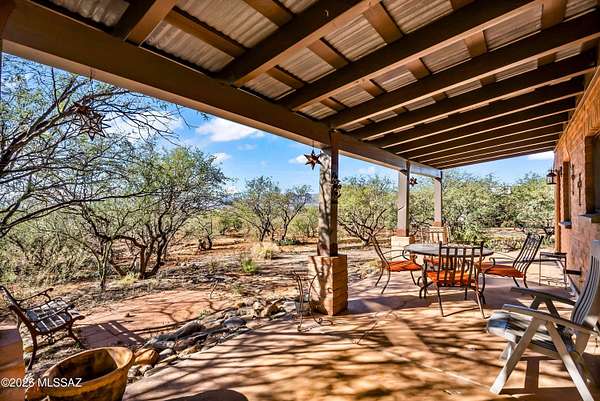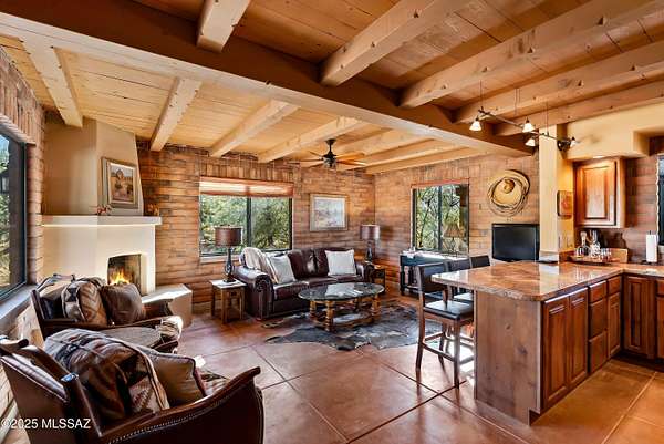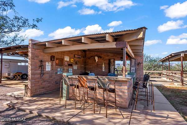 This equestrian property has everything you need to live comfortably! A stunning home w/ 2 master suites, Great room with exposed wood & beam ceilings, a beautiful wood burning fireplace flanked by windows and 2 entry doors on each side. The kitchen has a island w/ Spanish styled tiles, a wonderful butlers pantry w/ the main sink, dishwasher, refrigerator and plenty of cupboards. Gorgeous Stone flooring and wood flooring in the bedrooms. 2 covered porches w/ 360* mountain views! The equally stunning Casita has a beehive Fireplace, Granite countertops, exposed wood ceilings, bedroom w/ access to the rear covered patio, tiled walk-in shower & laundry closet. A ''cowboy'' bar under roof, outside of the tack room, has covered parking for 2 or 3 more vehicles or trailers. detached 2 c