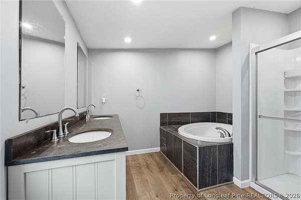 - Bath In Primary Bedroom, Built In Features, Ceiling Fans, Double Vanity, Eat In Kitchen, Garden Tub Roman Tub, Granite Counters, Primary Downstairs, Separate Shower, Walk In Closets, Window Treatments