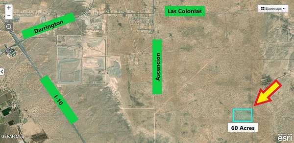 Est $1,357/mo60 acres of land just about 3 miles away from 1-10!! Wow, what a beautiful property! East El Paso is growing so fast and this could be a great investment property to have and hold. Owner financing available.
