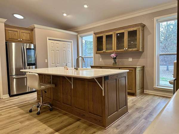 - Breakfast Bar, Built-Ins, Ceiling Fan(s), Walk-In Shower