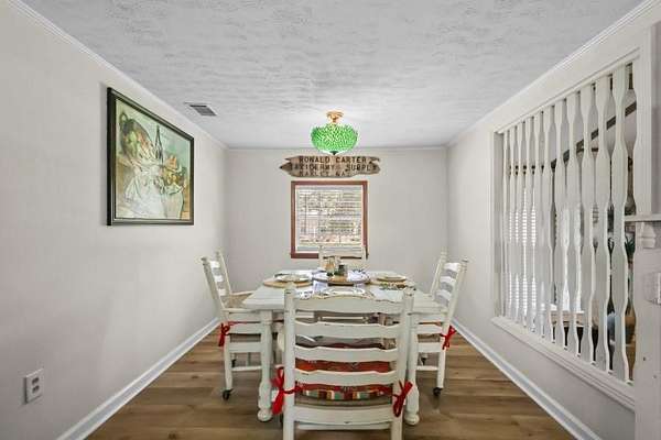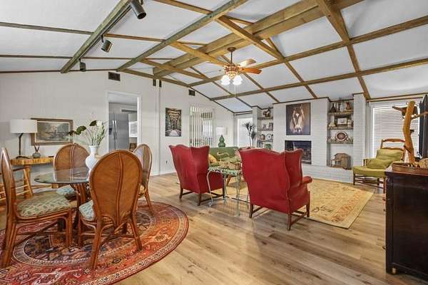 Step inside to find fresh updates, including luxury vinyl plank flooring and a new metal roof, adding style and peace of mind. The spacious living room features a wood-burning fireplace, creating a cozy setting for family gatherings or quiet evenings by the fire. The eat-in kitchen flows seamlessly into the living area and connects through a large foyer that could easily serve as a formal sitting room, office, or flexible bonus space to fit your lifestyle.