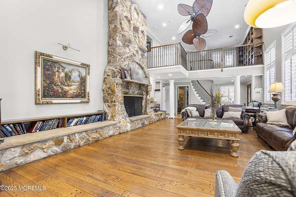 Est $12,738/moRare find! One-of-a-kind custom home set back on 3.44 private acres! Unique architecture and features throughout. First floor includes a kitchen and dinette area, large living room with 20 ft. ceilings, dining room, family room, home library, and two home offices - one with its own entrance. First floor also has a primary suite and two additional bedrooms. Second floor with large landing overlooking the living room, and three bedrooms with a full bathroom. Upstairs bedrooms lead to a porch that views the rear yard. Finished basement for extra living space plus an additional room. Lovely, huge fenced-in backyard with an in-ground pool. Much more! Dimensions are per tax data.