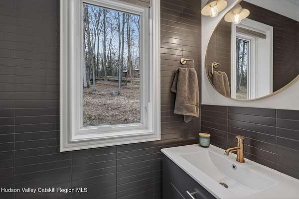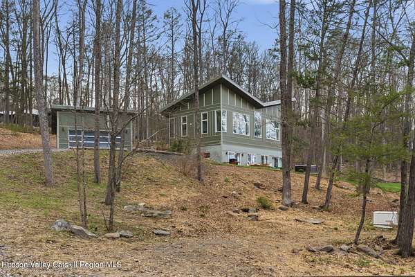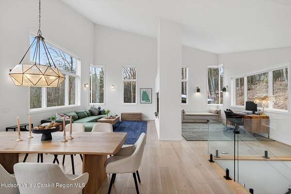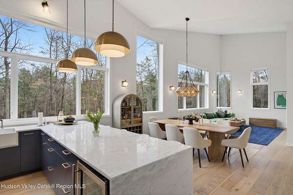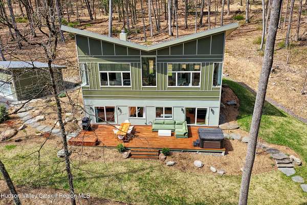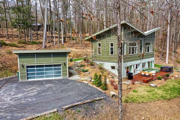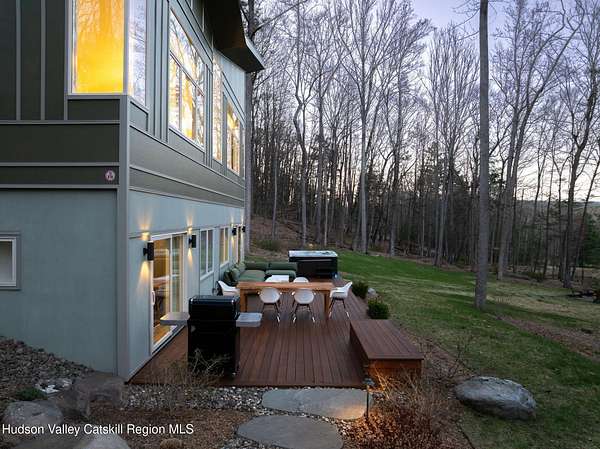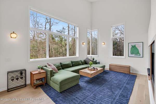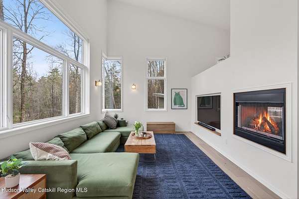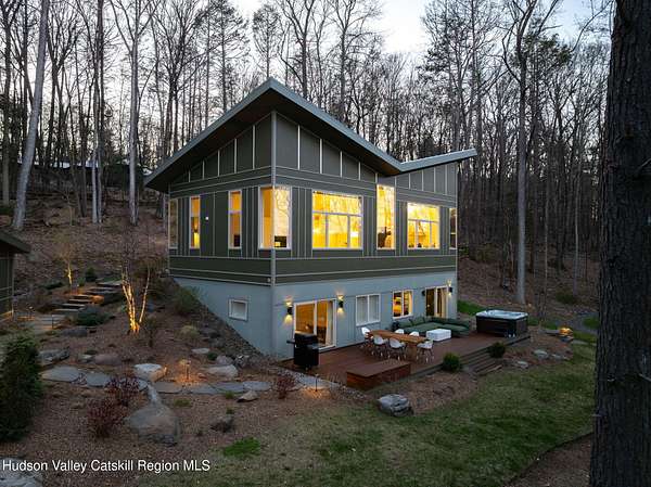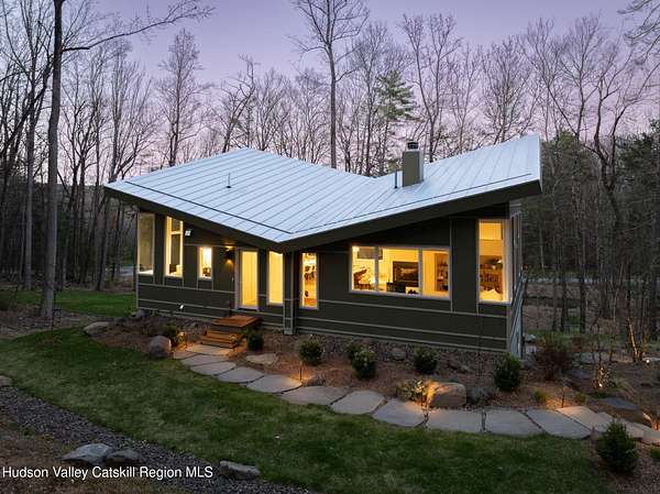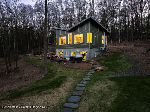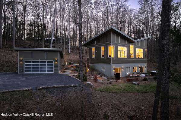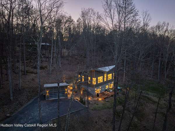 Stunning modern masterpiece offering 2,340 square feet of luxurious living space, thoughtfully designed to blend seamlessly with its natural surroundings--delivering the ultimate in serene country living. Privately set on 3.47 acres, this custom-built 2022 home is a true retreat. Soaring 20+ foot ceilings and dramatic floor-to-ceiling windows flood the interior with natural light while showcasing picturesque views from nearly every room. Solid white oak hardwood flooring runs throughout, adding warmth and timeless elegance, while radiant heating extends through both the main and lower levels, ensuring consistent comfort year-round. The living and family rooms are anchored by a striking double-sided gas fireplace, creating a stunning focal point and an inviting atmosphere. The gourmet kitchen is a chef's dream, featuring stainless steel appliances, a spacious farmhouse sink, built-in wine cooler, quartz countertops, and an oversized breakfast bar--perfect for entertaining. The main level offers an open-concept layout with a dining area, living and family rooms, a private office, and a stylish half bath. A glass-framed stairwell leads to the lower level, where you'll find three bedrooms, including two that share a beautifully appointed full bath--ideal for family or guests. The primary suite is a true oasis, complete with a spacious California-style walk-in closet and a spa-inspired bath featuring a freestanding soaking tub, expansive walk-in shower with designer tile, and a double vanity. A dedicated home gym offers flexibility as an additional office or playroom. Each room on the lower level is appointed with custom blackout shades and curtains and offers direct access through sliding glass doors to an oversized mahogany deck, overlooking beautifully manicured grounds. Step outside to enjoy resort-style amenities, including a fire pit, Aspen saltwater hot tub, and a detached garage equipped with separate electric and a radiant heat hookup already in place. Designed for low maintenance and high efficiency, the home features a standing seam metal roof, durable Hardie board siding, and extensive hand-laid bluestone patios and walkways, all beautifully enhanced by sensor-activated lighting that softly illuminates the property at twilight. Ideally located just 90 minutes from Metro New York, this exceptional property offers convenient access to the very best of the Hudson Valley--just minutes from Mohonk Preserve, Inness Resort, the O&W Rail Trail, charming shops, restaurants and so much more. Please see additional information in associated docs along with twilight video