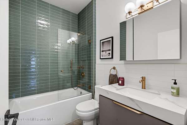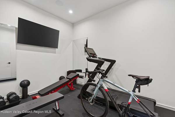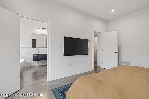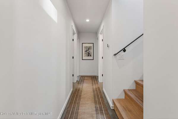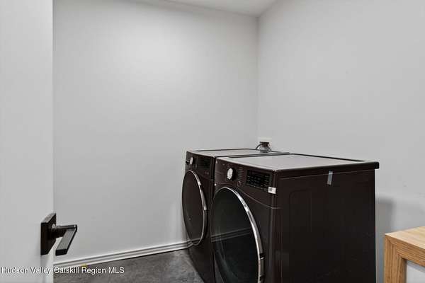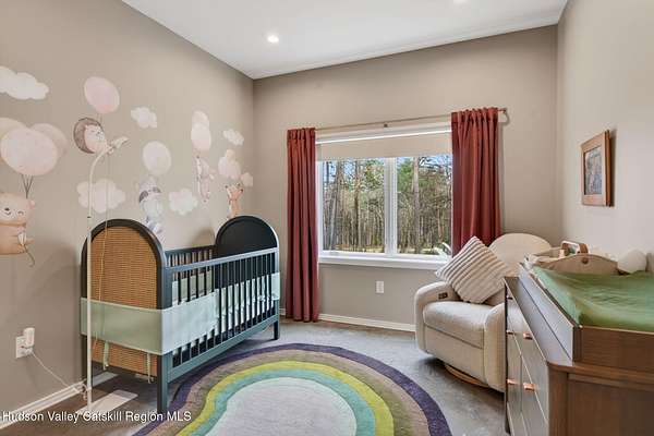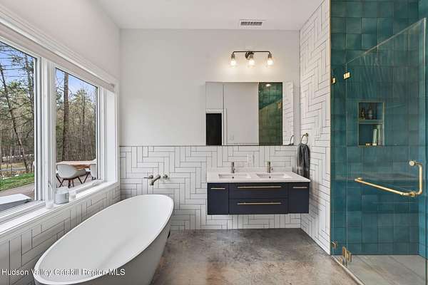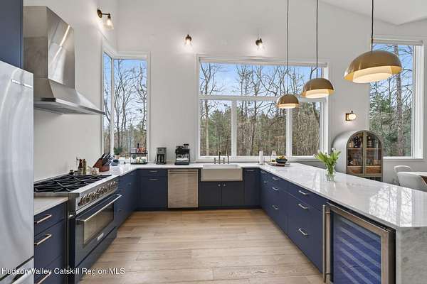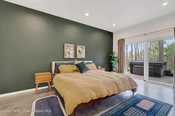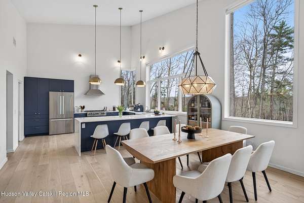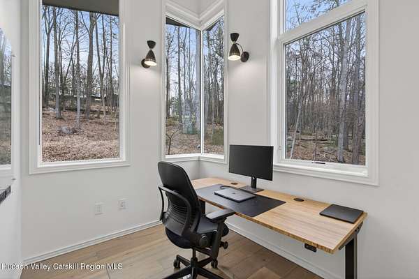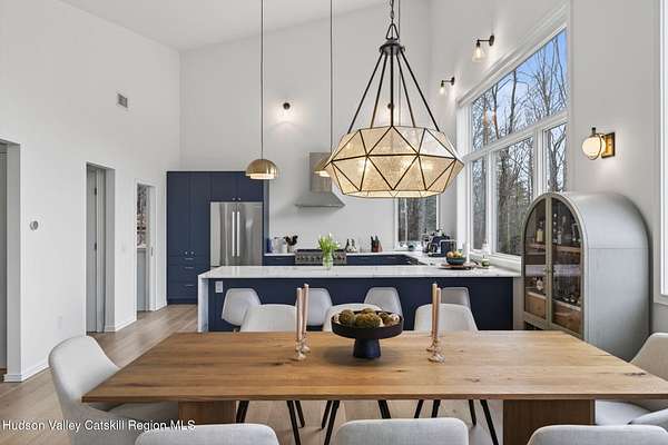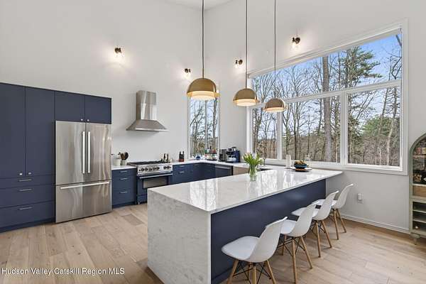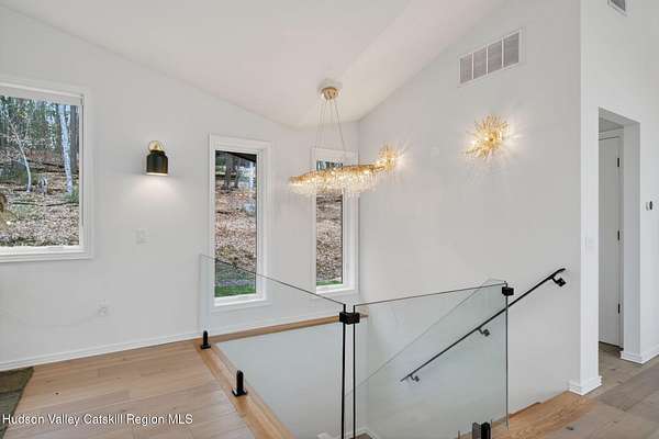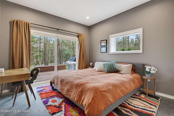 Stunning modern masterpiece offering 2,340 square feet of luxurious living space, thoughtfully designed to blend seamlessly with its natural surroundings--delivering the ultimate in serene country living. Privately set on 3.47 acres, this custom-built 2022 home is a true retreat. Soaring 20+ foot ceilings and dramatic floor-to-ceiling windows flood the interior with natural light while showcasing picturesque views from nearly every room. Solid white oak hardwood flooring runs throughout, adding warmth and timeless elegance, while radiant heating extends through both the main and lower levels, ensuring consistent comfort year-round. The living and family rooms are anchored by a striking double-sided gas fireplace, creating a stunning focal point and an inviting atmosphere. The gourmet kitchen is a chef's dream, featuring stainless steel appliances, a spacious farmhouse sink, built-in wine cooler, quartz countertops, and an oversized breakfast bar--perfect for entertaining. The main level offers an open-concept layout with a dining area, living and family rooms, a private office, and a stylish half bath. A glass-framed stairwell leads to the lower level, where you'll find three bedrooms, including two that share a beautifully appointed full bath--ideal for family or guests. The primary suite is a true oasis, complete with a spacious California-style walk-in closet and a spa-inspired bath featuring a freestanding soaking tub, expansive walk-in shower with designer tile, and a double vanity. A dedicated home gym offers flexibility as an additional office or playroom. Each room on the lower level is appointed with custom blackout shades and curtains and offers direct access through sliding glass doors to an oversized mahogany deck, overlooking beautifully manicured grounds. Step outside to enjoy resort-style amenities, including a fire pit, Aspen saltwater hot tub, and a detached garage equipped with separate electric and a radiant heat hookup already in place. Designed for low maintenance and high efficiency, the home features a standing seam metal roof, durable Hardie board siding, and extensive hand-laid bluestone patios and walkways, all beautifully enhanced by sensor-activated lighting that softly illuminates the property at twilight. Ideally located just 90 minutes from Metro New York, this exceptional property offers convenient access to the very best of the Hudson Valley--just minutes from Mohonk Preserve, Inness Resort, the O&W Rail Trail, charming shops, restaurants and so much more. Please see additional information in associated docs along with twilight video