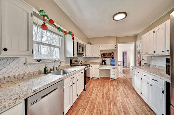 - Barn Door(s), Beamed Ceilings, Crown Molding, Laminate Counters, Master Downstairs, Multi Panel Doors, Pantry, Walk-In Closet(s)