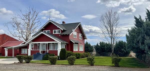 Experience the perfect blend of country charm and functionality with this inviting two-story farmhouse set on approximately 3 acres, offering breathtaking views of Mt. Adams. With 3 bedrooms, 2 bathrooms, and 3,004 square feet of living space, this property provides room to spread out both indoors and out. The home features a warm and welcoming layout, including a large, partially finished basement ideal for bonus living space, hobbies, or storage. The upstairs bathroom was tastefully remodeled around 2018/2019, and recent exterior paint adds fresh curb appeal. Comfort is ensured year-round with a York heat pump, central A/C, and all appliances included for move-in ease. The composition roof is approximately 12 years old. Outside the immediate yard is partially fenced and equipped with underground sprinklers on a timer, creating a manageable and enjoyable outdoor space. dding to the versatility of the property is a 336-square foot detached building, perfect for a private office, studio, storage, or potential future ADU (buyer to verify). Those seeking serious workspace will appreciate the impressive outbuildings. The insulated and heated 50x50 metal shop (2,500 SF) is equipped with a large electric roll-up door, making it ideal for projects, equipment, or business use. Additionally, the expansive 50x100 machine shed offers four bays, gravel floors, and approximately 5,000 square feet of covered storage. Whether you're looking for a peaceful country setting, room for hobbies or business operations, this unique property offers endless possibilities. A rare opportunity to own highly functional homestead with space to live, work, and grow.