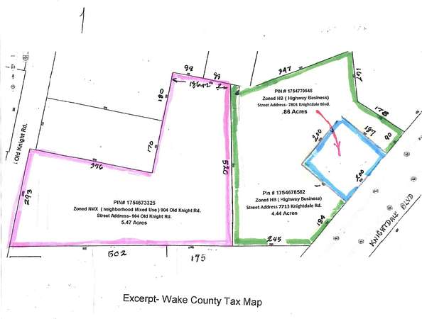 All utilities are available to this property including natural gas. Please read the remarks and agent remarks in MLS #s 2507086 and 2507091 regarding permitted uses in the Knightdale Unified Development Ordinance ( UDO) Chapter 3. There is approximately 474 linear ft of road frontage on Knightdale Blvd with the combination of 7801 and 7713 Knightdale properties which are both zoned HB, Highway Business.