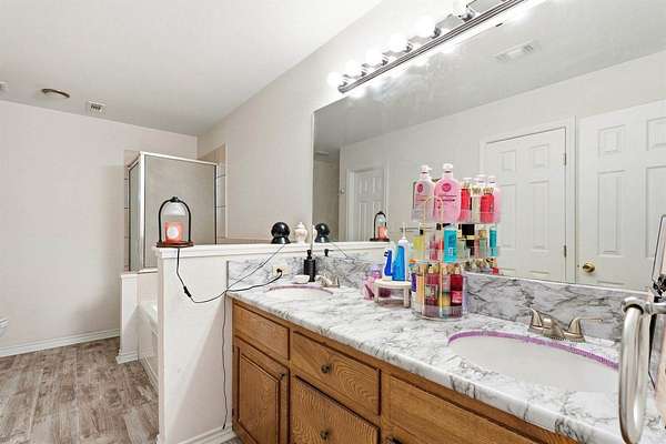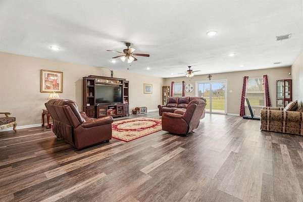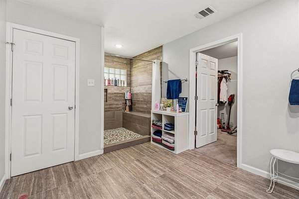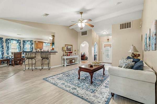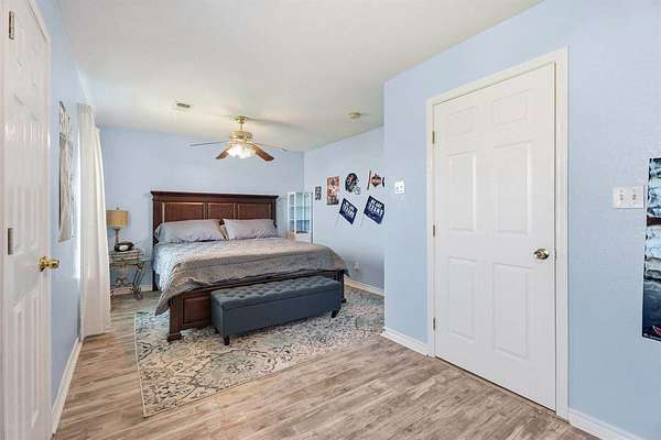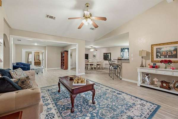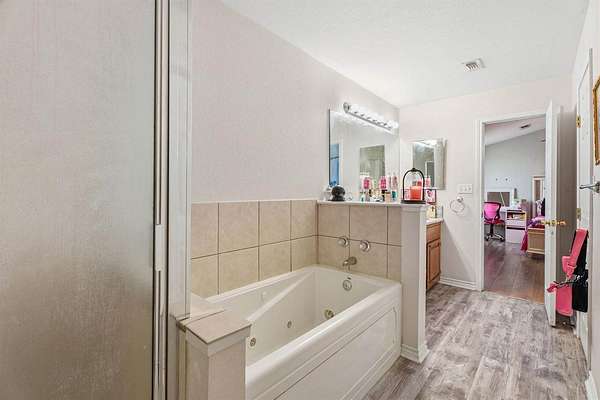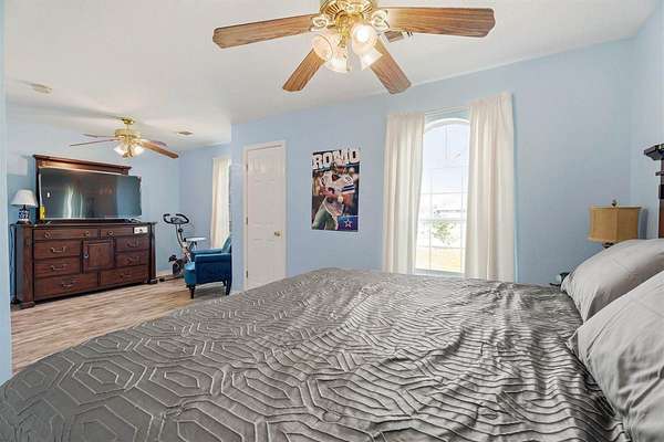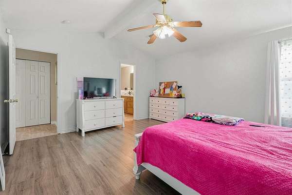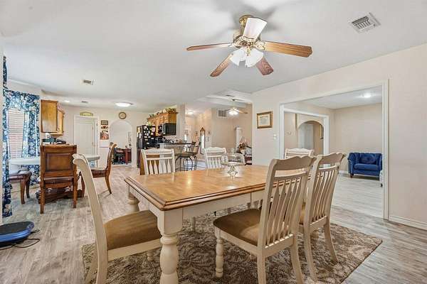Impressive single-story home set on a rare oversized lot in Hitchcock, offering exceptional space for both indoor and outdoor living. The expansive grounds provide endless opportunities for entertaining, recreation, or future enhancements, all complemented by mature trees that add privacy and charm. Inside, the thoughtfully designed layout features multiple living areas that flow seamlessly into a generously sized dining space and a well-appointed kitchen with abundant cabinetry and counter space. The primary suite serves as a private retreat with a spacious bedroom, walk-in closet, and an ensuite bath featuring dual vanities, a soaking tub, and a separate shower. Secondary bedrooms are well-proportioned and versatile for guests, family, or a home office. A circular driveway enhances both curb appeal and convenience with ample parking. With its standout lot size and flexible layout, this home offers a perfect blend of comfort, functionality, and potential.