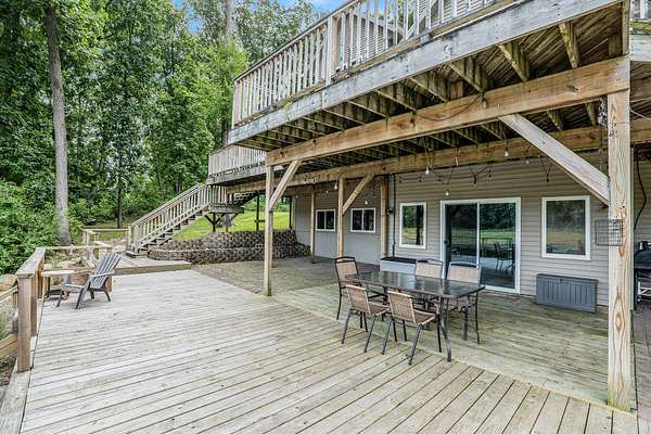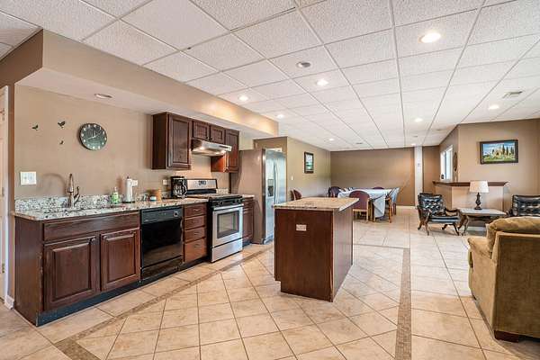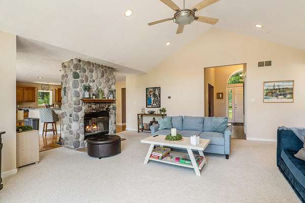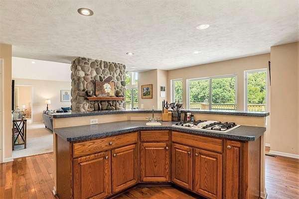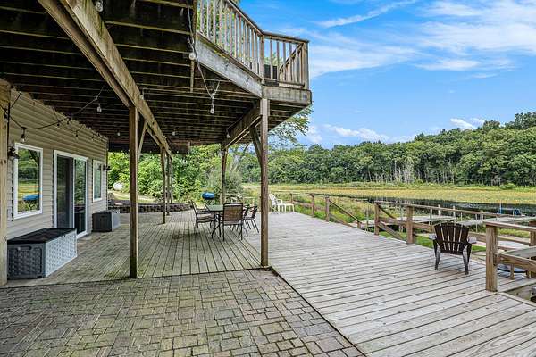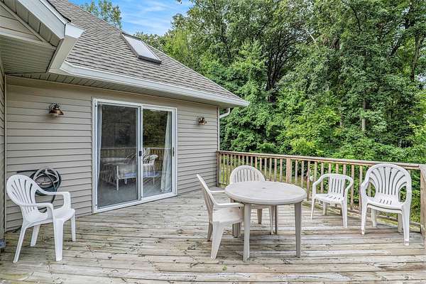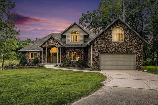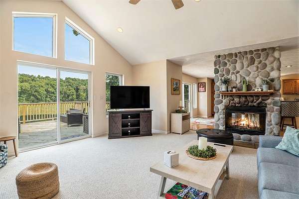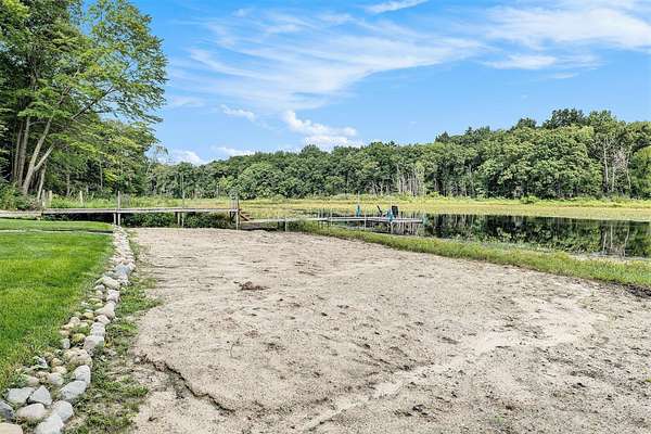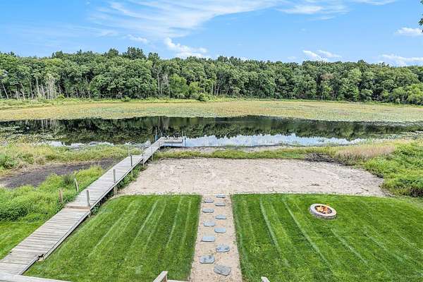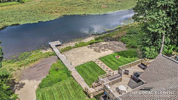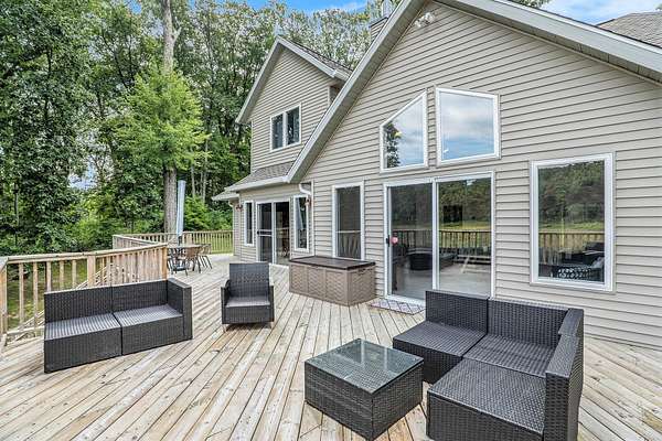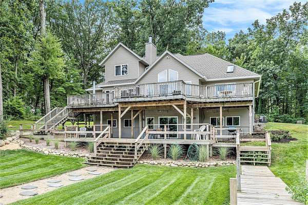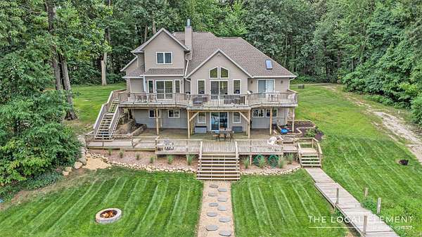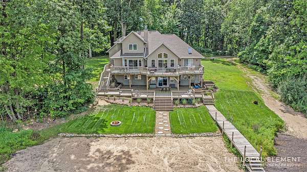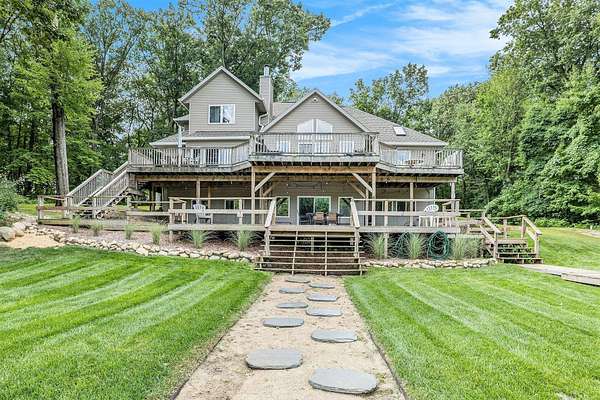 Welcome to your own slice of lakefront heaven on Upper Crooked Lake. This custom home with walkout lower-level sits on over 2 acres with 460+ feet of private frontage on a 700-acre all-sports lake. The home offers more than 3,200 finished square feet, including a vaulted living room with a stone fireplace, a spacious kitchen with island and oak cabinetry, formal dining, and a main-level primary suite with deck access. Upstairs you'll find two additional bedrooms and a full bath. The finished walkout level is designed for entertaining with a large family room, full wet bar with cherry cabinetry, a second kitchen area, bedroom, and bath. Outside, enjoy the oversized deck, patio, sandy beach, and dock. Recent updates include landscaping, added beach sand, and mechanical upgrades. Completely private location. Within an hour of Kalamazoo or Grand Rapids. Furniture and boat are negotiable. Whether full-time living, short-term investment, or a weekend getaway, this property offers the rare blend of total privacy and quick access; just minutes to coffee shops, restaurants, golf, state parks, and even the casino.