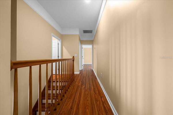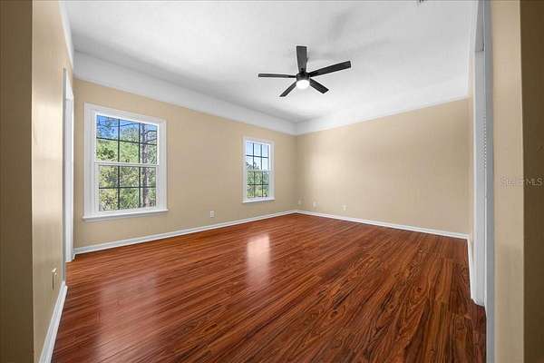 Upstairs, four additional bedrooms with hardwood flooring are connected by Jack-and-Jill bathrooms, and a second-floor laundry area adds everyday convenience. Ceiling fans are installed throughout all bedrooms.
