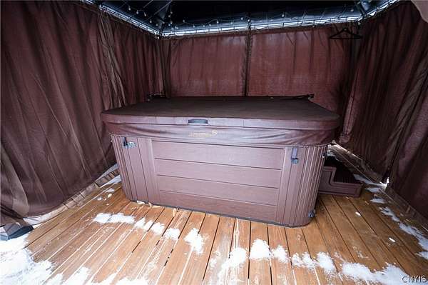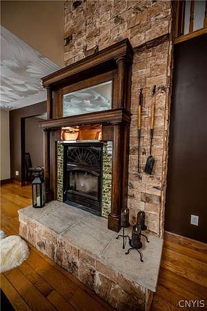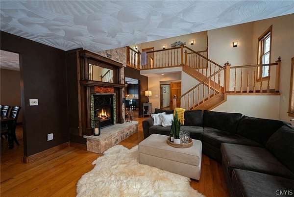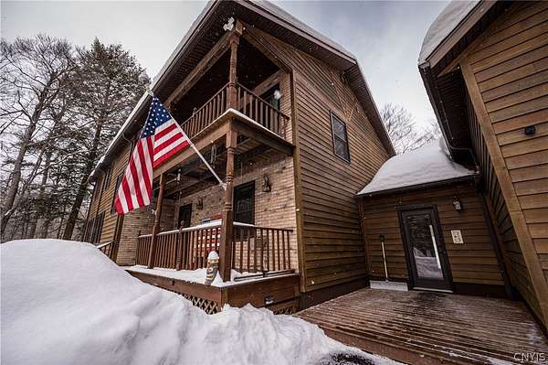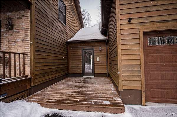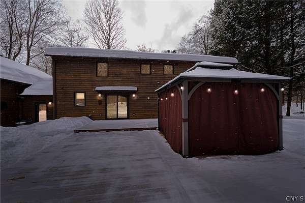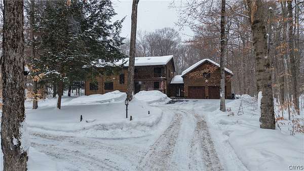 New to the market! a stunning retreat that perfectly blends Adirondack-inspired charm with modern luxury. This contemporary home, situated on a peaceful 2.83-acre lot within the Holland Patent school district, offers a serene forest estate, on a less traveled road, a mere 15 minutes from the city hubs of Utica and Rome. 7808 Wood Road, in Barneveld New York, sets well off the road with a double entrance, circular driveway. Durable cedar siding protects the home and blends in with the natural surrounds. Enter the home through a very well thought out room, joining the 2 stall garage with second level awaiting your design ideas, and the home... a large mudroom. Superb for storing outdoor gear, coats, boots and accommodating muddy paws. Stepping Inside, the home features beautiful pine plank flooring and a magnificent vaulted living room with a grand staircase and a cozy wood-burning insert fireplace. Formal foyer pulls one in to the warm and inviting spaces. The high-end replacement windows and doors throughout allow the beauty of the forest indoors. The heart of the home is a large eat-in kitchen equipped with stainless appliances, quartz countertops, warm-toned cabinetry, and a convenient coffee bar with a wine cooler. For more formal occasions, the spacious dining room easily accommodates large suites. A bonus room on this main level can provide needed office space or, an additional 4th bedroom as there is a full bath on this level of living. Upstairs, you will find three bedrooms, including a sprawling master suite with a gigantic walk-in closet, a private balcony porch, and a dedicated master bath. A brand-new guest bath was created to serve the two guest bedrooms. The basement boasts full poured wall concrete construction with partially finished living space. High end Buderus boiler with Danfoss radiator adjusters create a multi zone heating environment. The home setting encourages outdoor living! Expansive outdoor decks, 2 porches, and a gazebo covered, all season hot tub, with various trails on the property offers a wonderful way of life! Come experience the perfect balance of rustic charm and contemporary elegance!