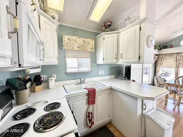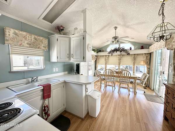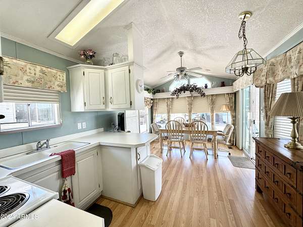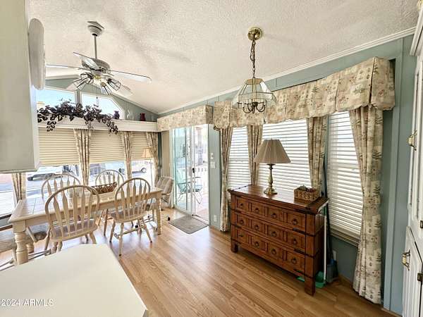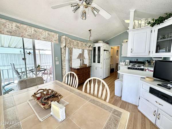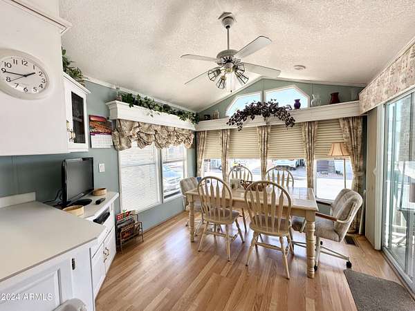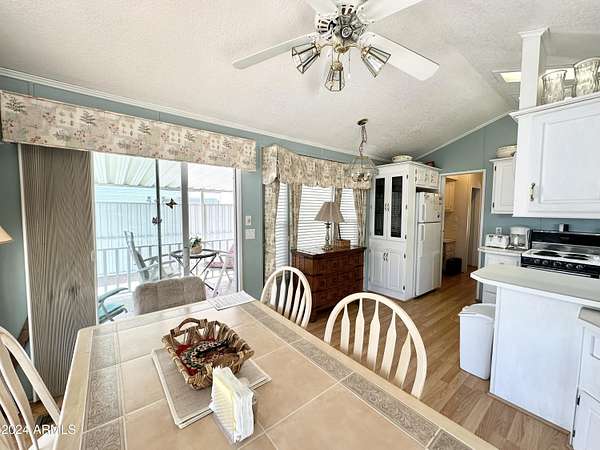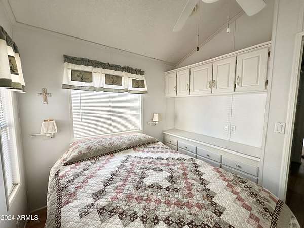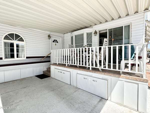 FANTASTIC RESORT LOCATION JUST A SHORT WALK TO THE CLUBHOUSE! SOUTH FACING & NICE CURB APPEAL! GRAND TILED OUTDOOR DECK W/ STORAGE DRAWERS BELOW is PERFECT to lounge the day away & take in the GORGEOUS AZ WEATHER! SIZABLE CARPORT & AMBLE outdoor space to enjoy. LIGHT & BRIGHT front living area w/ lots of LARGE WINDOWS, NICE WINDOW COVERINGS & A FANTASTIC OPEN FLOOR PLAN. IDEAL for entertaining, you will love whipping up your favorites in the POPULAR U-SHAPED KITCHEN w/ FRESH WHITE CABINETS & PLENTY OF THEM. GORGEOUS LAMINATE WOOD LOOK FLOORING makes this home INVITING & EASY to clean. AWESOME built in desk area adjacent to the main ROOMY bathroom offering a TUB/SHOWER COMBO & FANTASTIC VANITY & CABINET SPACE! DREAMY bedroom w/ LARGE MIRRORED CLOSET, BUILT IN DRESSER & COMFY BED. SPACIOUS AZ room is IDEAL for guests, large for entertaining & makes a GREAT second living area! YOUR GUESTS will lOVE the PRIVACY of having their own bathroom featuring a WALK IN SHOWER & SIZABLE area to get ready! LAUNDRY AREA is convenient and OFFERS a LARGE CLOSET for additional storage space. THIS ONE HAS STORAGE GALORE! FULLY FURNISHED, NEWER A/C UNIT IN 2017, BRAND NEW ROOF, NEW REFRIDGERATOR & READY FOR A NEW OWNER! APPROX 800 sq ft, 1996 Kensington. COME JOIN THE fun in this TOP TIER 55+ RESORT! OWN THE LAND...OWN THE FUN! TOO MANY ACTIVITIES TO LIST. YOU can make this your PERFECT DESERT OASIS!