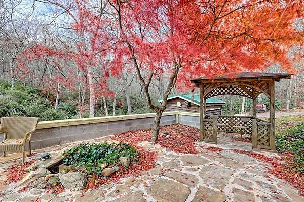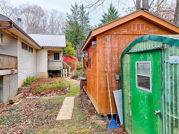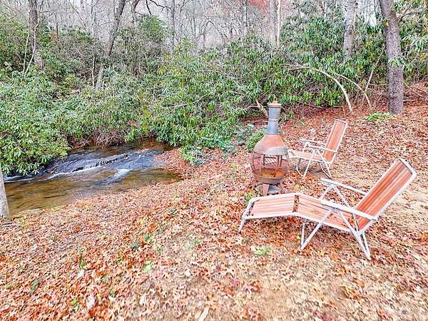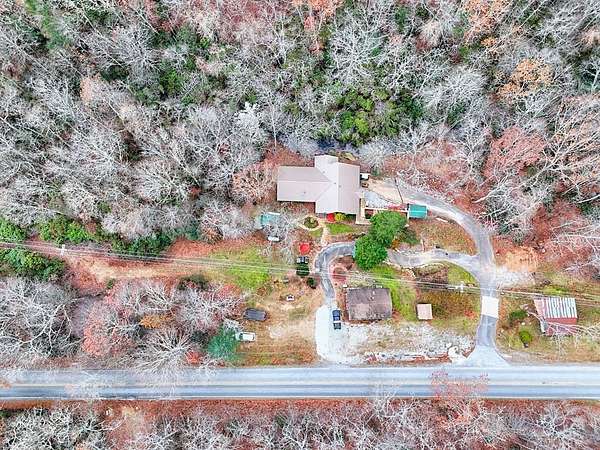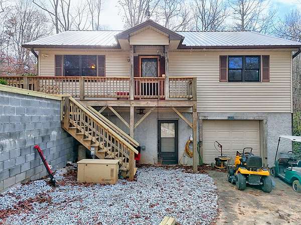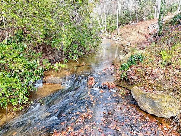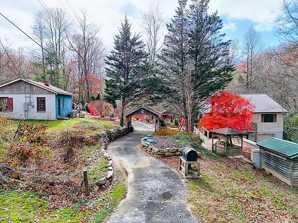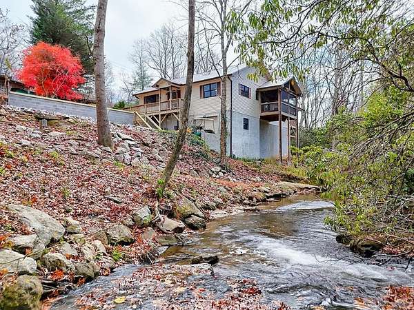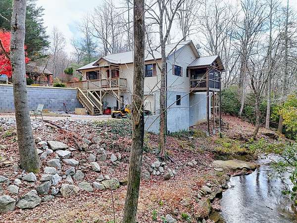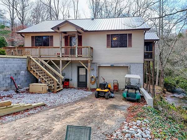 A Wonderful 3-bedroom, 2-bathroom, mountain homeplace overlooking a fast-flowing creek on 5 wooded acres. There are 2 large, covered porches for relaxing Creekside. The living room has beautiful all-wood ceilings; a wood-burning stove with stacked rock wall and rock hearth, and large picture windows to take in the views of the creek. It has a circular driveway with a small carport and a ramp walkway to the side door entrance. There is a full, unfinished basement with a tuck-under garage and a separate driveway. This property has tons of potential. There are picnic areas along the creek, Garden spots, several outbuildings for your chickens, or commercial potential along the road. One of the buildings along the road has a bathroom and used to be an antique store. One of the other buildings used to be an art studio. The property is not in a subdivision, so it may be able to be subdivided with permission from Macon County. This rare find property was built by and has been enjoyed by the same family for several years but is now ready for you to make it yours. Only 10 minutes to Highlands, NC and Sky Valley, GA. Located within a few minutes of several wineries, hiking trails, Ziplining,