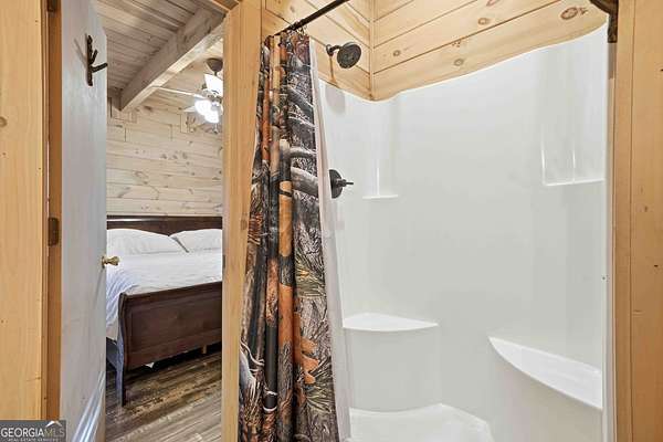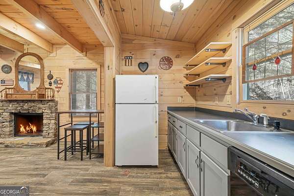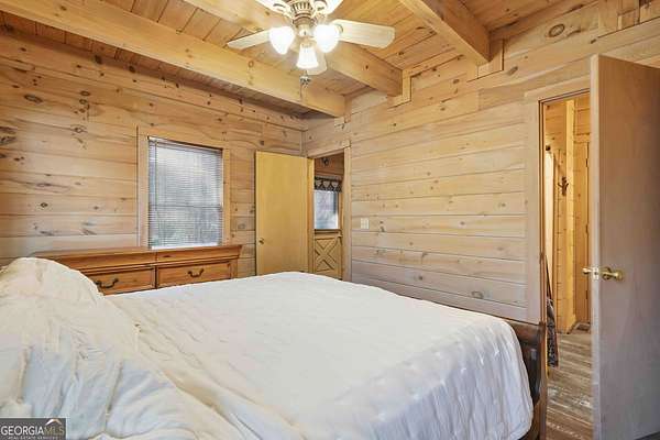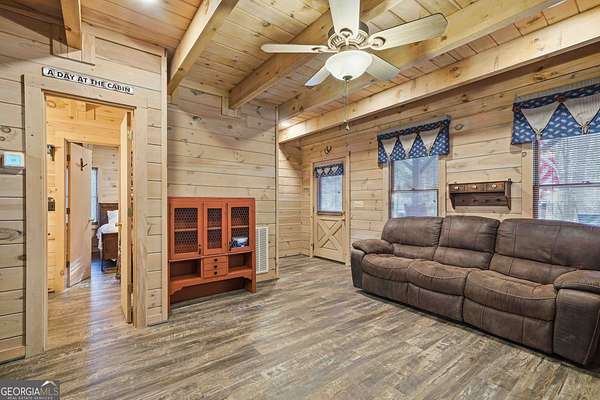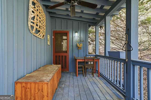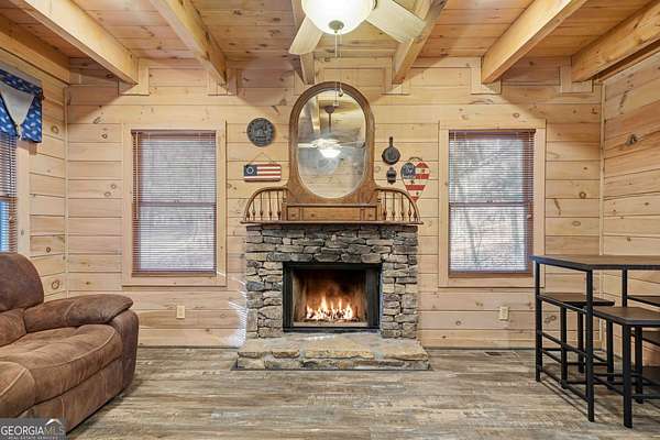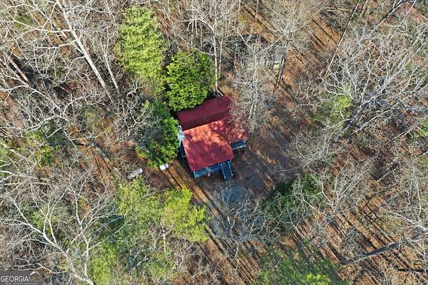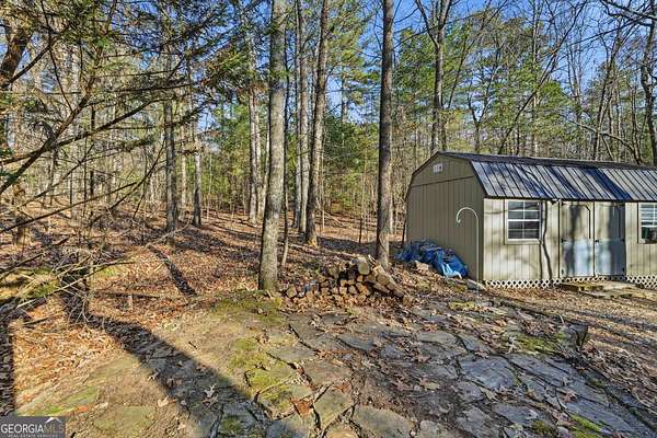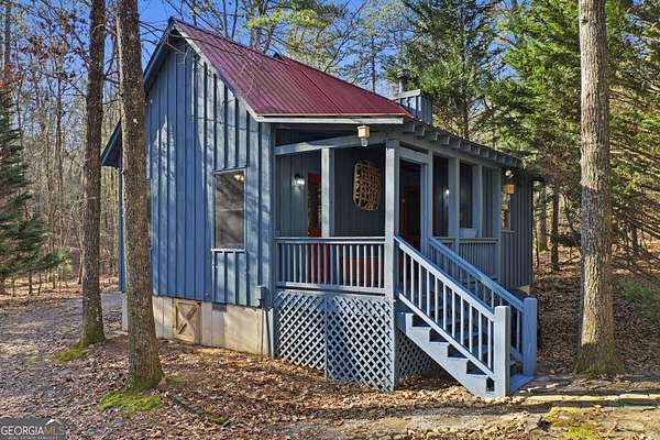 Tucked away in the woods on 2.33 private acres, this cozy mountain cabin is a charming retreat with classic Americana character, featuring red and blue exterior accents that perfectly complement its charming setting. The 1 bedroom, 1 bathroom cabin offers 600 square feet of warm, inviting space with an all-wood interior and a wood-burning fireplace - ideal for cozy evenings year-round. Enjoy the peaceful outdoors from two welcoming porches, perfect for morning coffee or relaxing after a day of adventure. A major highlight of this home is the generator, providing dependable power and added peace of mind - an invaluable feature for mountain living. The property also includes a convenient 7' x 20' storage shed, ideal for storing tools, outdoor gear, or seasonal items. Whether you're searching for a weekend getaway, a private mountain escape, or a vacation rental opportunity, this cabin delivers comfort, charm, and functionality. Located less than 5 miles from downtown Ellijay and close to the Cartecay River, you'll enjoy easy access to local shops, dining, wineries, and outdoor recreation - while still feeling tucked away in your own quiet mountain hideaway.