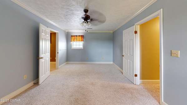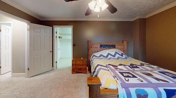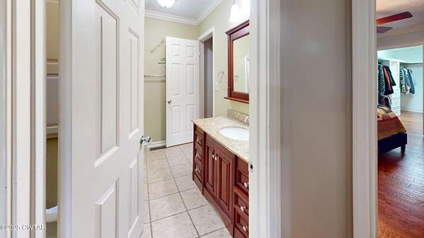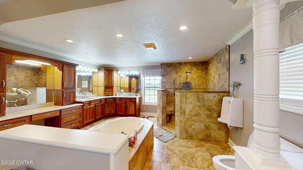 - Ceiling Fan(s), Ceramic Tile Shower, Double Vanity, Granite Counters, Kitchen Island, Primary Downstairs, Tile Counters, Tub Shower Combo, Walk-In Closet(s)