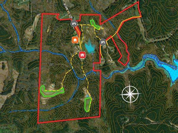 Wildlife and Hunting: Attracts abundant small game, deer, turkey, and even occasional bears. Three managed food plots (totaling 4.62 acres) are planted with seasonal wildlife blends. Strategically placed are three Banks box blinds and three Steel Outdoors metal feeders, accessible via about 1 mile of roads and trails to minimize wildlife disturbance.