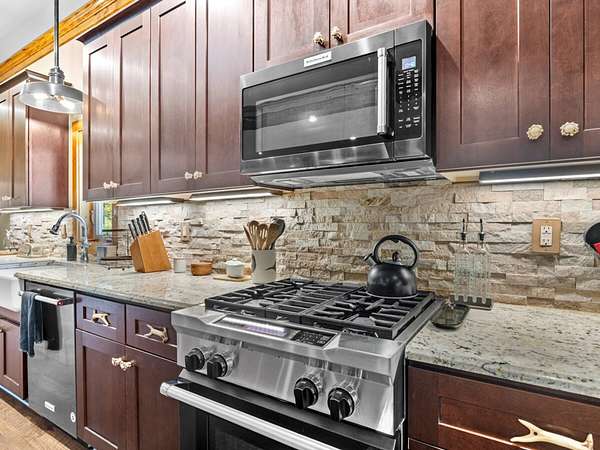 Outdoor Spaces: A large upper-level deck covered side porches on both sides, and a shaded sitting area beneath the deck provide ample room for socializing and enjoying views. A rock path leads to a firepit overlooking the stocked pond--perfect for unwinding after a day of activities, sharing stories, or roasting marshmallows. All outdoor furniture, including folding tables and chairs for large groups, are included.