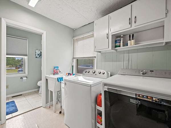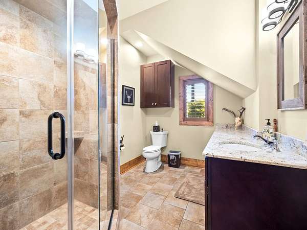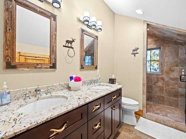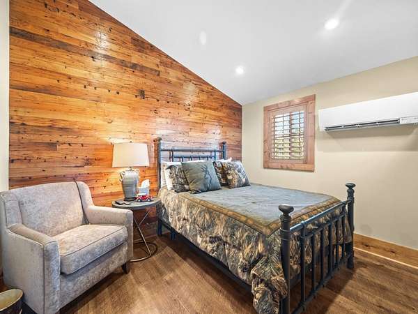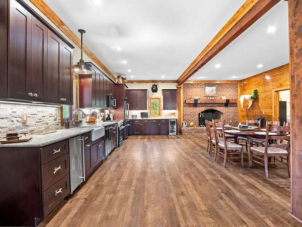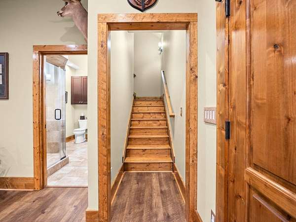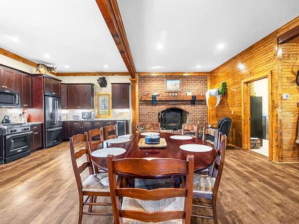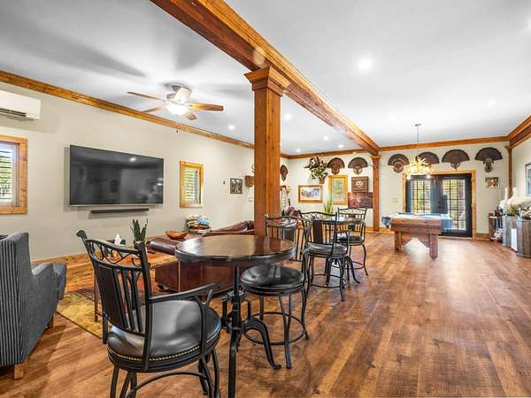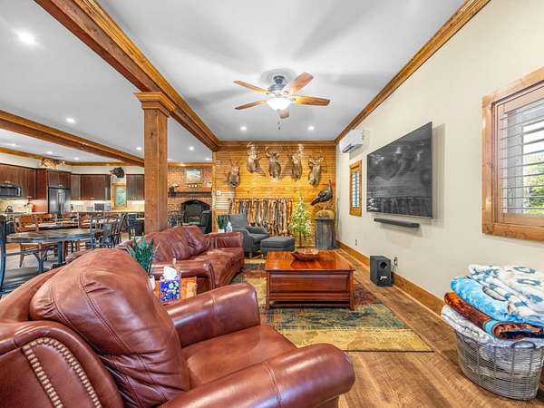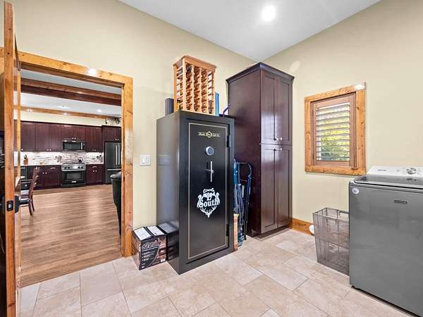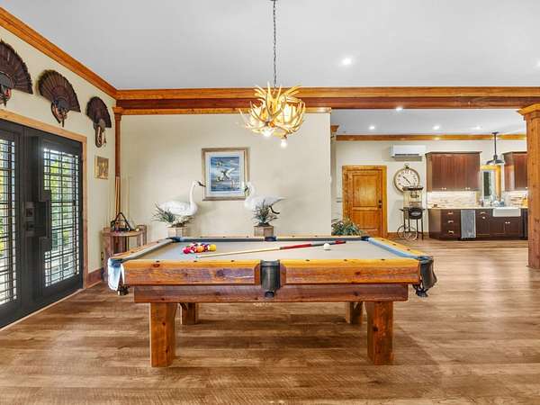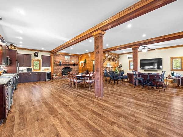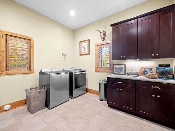 Hunter-Friendly Amenities: The lower level boasts a mud room for gear storage, a large safe for firearms, and a washer/dryer. Set up for entertaining and relaxing with its extra-large fireplace with gas logs or can be used as a wood burner too, TV sitting area with 82” flat screen, custom pool table, and dart board. Walls are primed for displaying hunting trophies, enhancing the classic hunt camp vibe. A large full bathroom with tile shower on this level accommodates overnight guests.