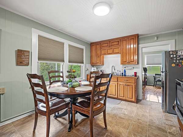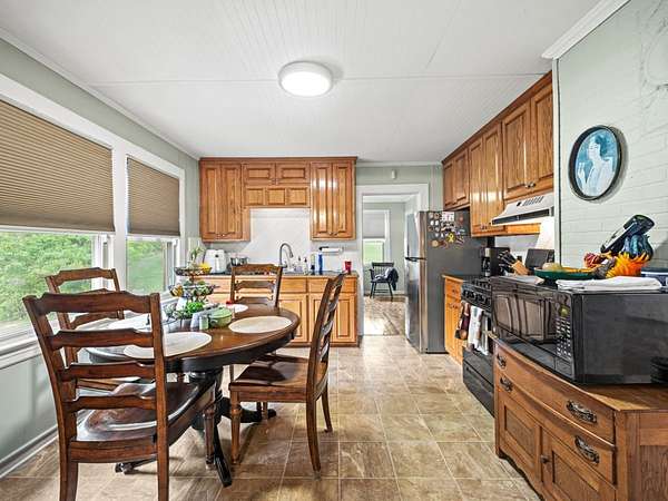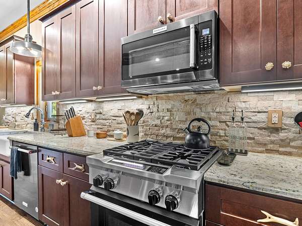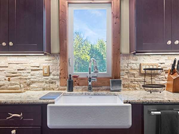 Spacious Kitchen: Equipped with a built-in icemaker, dishwasher, refrigerator, gas range, microwave, and wine cooler. Ample cabinets and drawers, along with generous countertops for food prep and serving, surround a large farm sink. Well-lit and functional, it includes iron bar chairs, tables, and a dining set—all conveyed with the sale.