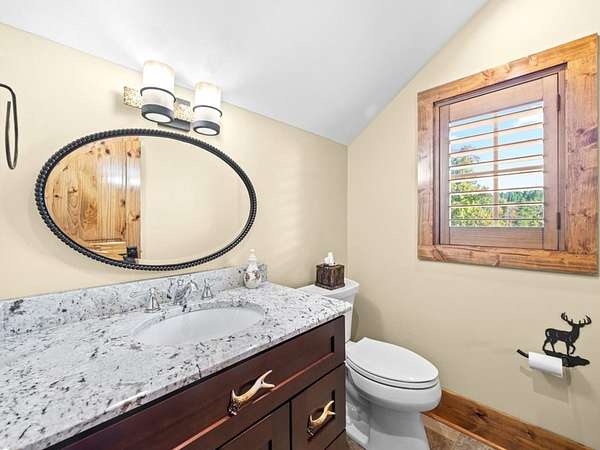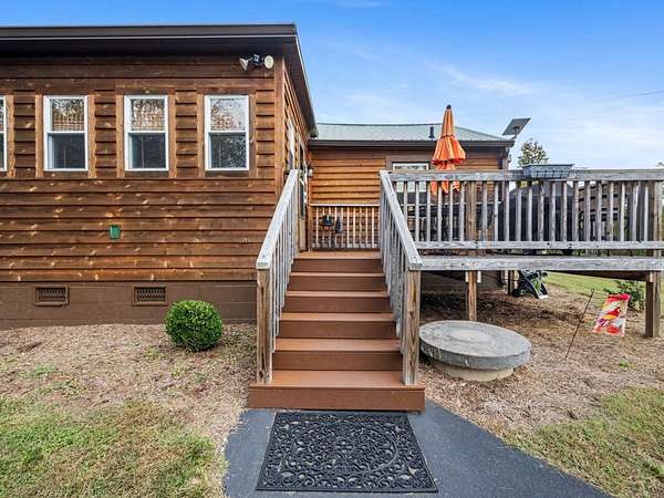 Outdoor Spaces: A large upper-level deck covered side porches on both sides, and a shaded sitting area beneath the deck provide ample room for socializing and enjoying views. A rock path leads to a firepit overlooking the stocked pond—perfect for unwinding after a day of activities, sharing stories, or roasting marshmallows. All outdoor furniture, including folding tables and chairs for large groups, are included.