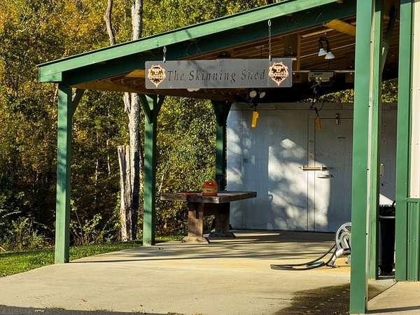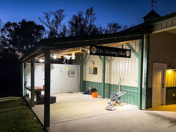 Skinning Shed: An extension of the workshop on a concrete pad, well-lit with water access—capable of handling multiple deer and easy to clean. Skinning shed includes a walk-in cooler to hang and age your venison