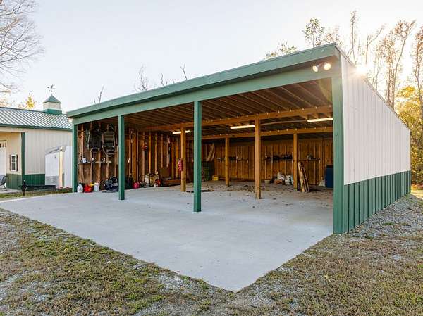30'x36' Pole Barn: Three deep bays for storing tractors, implements, ATVs, and supplies. Features concrete floors, full electrical service, and matching build quality to the workshop.