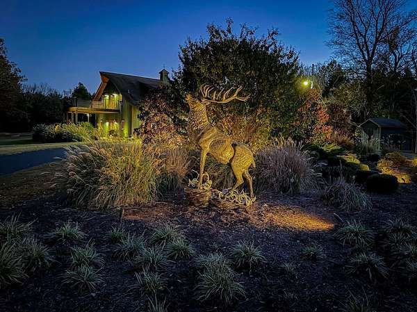 30'x30' Workshop: Insulated with a roll-up door, steel sheathing on walls and ceiling, and a ceiling-mounted electric heater for year-round comfort. Plenty of space for tools and equipment, topped with a "running buck" wind vane for a sportsman's flair.