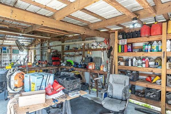 Outside, perimeter fencing and a fully stocked pond with a solar-lit dock set the scene; there's also an above-ground pool, children's playset, chicken coop, and room to roam. A 36'x42' powered workshop with lighting, 150-PSI air compressor, and a welding-capable plug is ready for projects, plus a 30-amp RV hookup, covered RV shelter, two powered sheds, and a gated driveway. Security cameras convey.