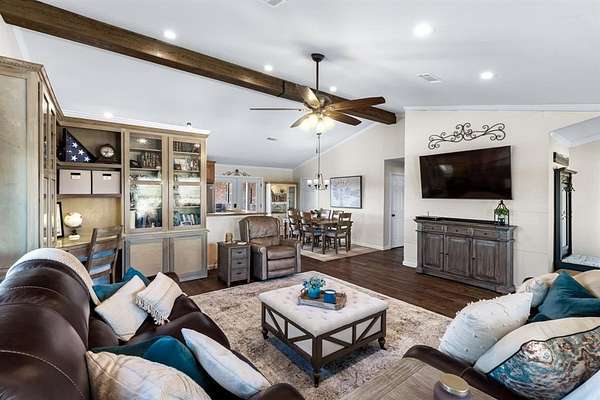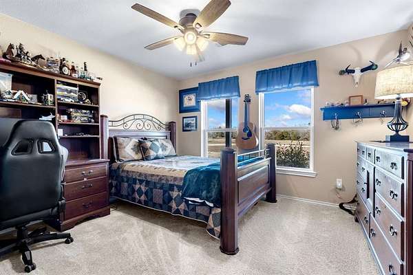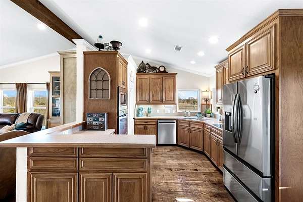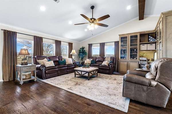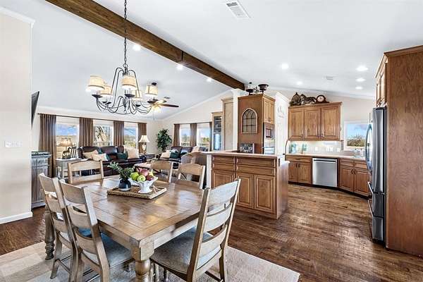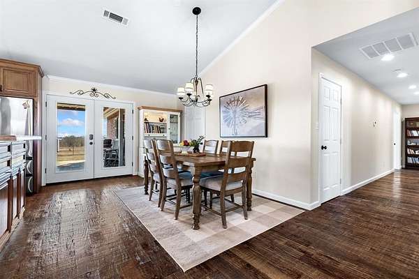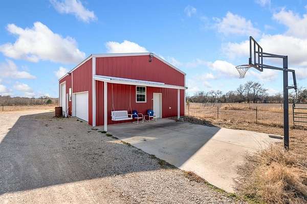 Situated on just under 12 scenic acres with AG Exemption in a fast-growing area, this one-story property offers the rare combination of lifestyle appeal and strategic investment potential. A circular drive and welcoming front porch create immediate curb appeal, while inside you'll find 3 bedrooms and 2 full baths arranged in a spacious open floor plan all accessible with 36-inch-wide door frames and low threshold entry to home. Rich hand-scraped hardwood flooring anchors the main living areas, and newly replaced windows frame sweeping views of the private surroundings. An oversized covered patio is ideal for entertaining or simply enjoying the peaceful acreage.