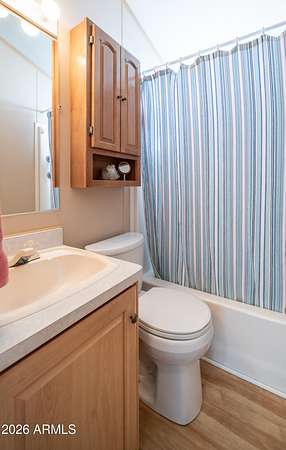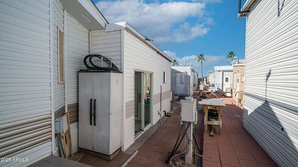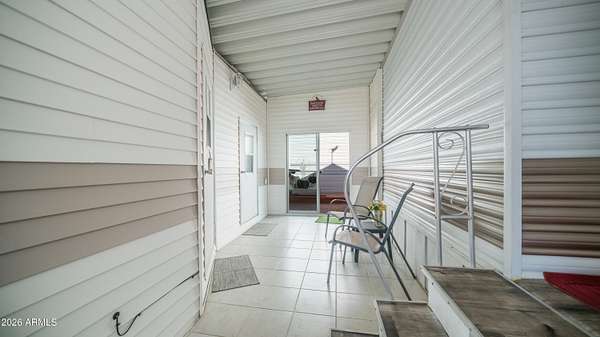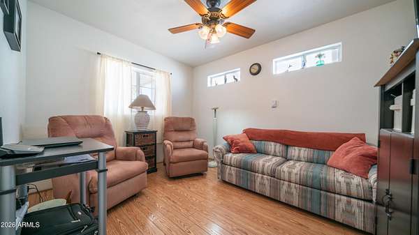 You will absolutely love this beautifully maintained 1998 home that radiates pride of ownership from the moment you arrive. The spacious carport easily accommodates larger vehicles while the enclosed patio creates a private outdoor retreat that is perfect for relaxing, entertaining, & enjoying time with friends. Step inside to vaulted ceilings paired with updated solid surface flooring that flows throughout the home. Warm inviting tones plus abundant natural light fill every space creating a cozy welcoming atmosphere you will instantly feel at home in. The charming U shaped kitchen offers plenty of counter space making it ideal for preparing meals, snacks, or hosting casual gatherings. The bathroom features a convenient tub shower combo while the bedroom provides generous built in storage plus a comfortable queen size bed creating a peaceful place to unwind after a full day of activities. One of the true highlights of this home is the added living room/ man cave/ hobby room, which offers incredible versatility to fit your lifestyle needs. Complete with its own cooling & heating system this space is ideal for hosting guests, pursuing hobbies, or enjoying quiet personal time. A separate laundry room/ storage room/ workshop adds even more value featuring a full size washer & dryer making everyday living easy without trips to the laundromat. All of this is located within the sought after 55+ community of Golden Vista where you own the land! Enjoy resort style amenities including 2 pools, a spa, a gym, a woodworking shop, pickleball courts, bocce ball, batting cages, a library, & so much more making this the perfect place to enjoy an active relaxing lifestyle.