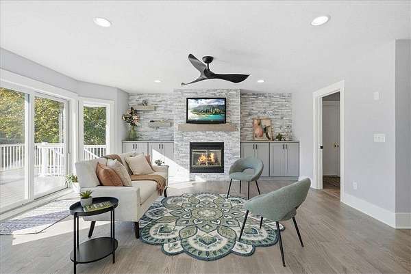 The main level includes a dedicated office, while the living area showcases a brand new stone surround fireplace and abundant natural light through two new sliding patio doors. Custom 500 lb mahogany entry doors with rain glass windows add impressive craftsmanship throughout.
