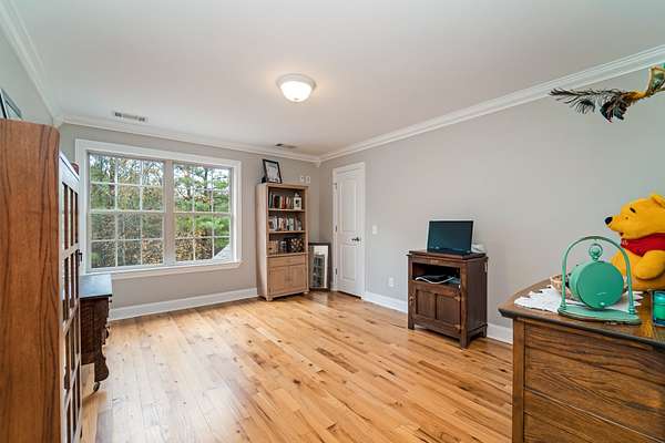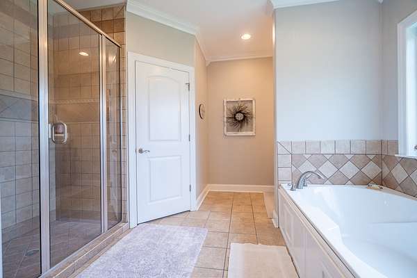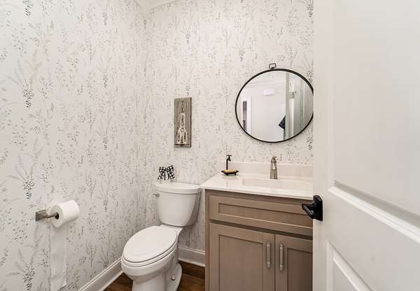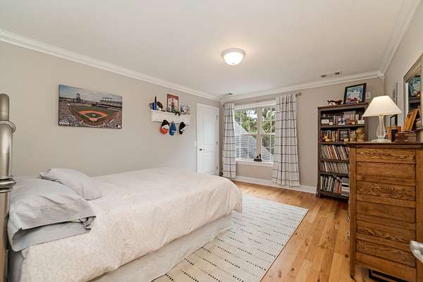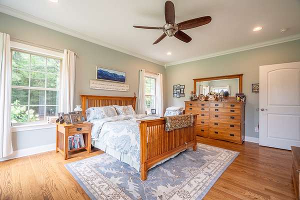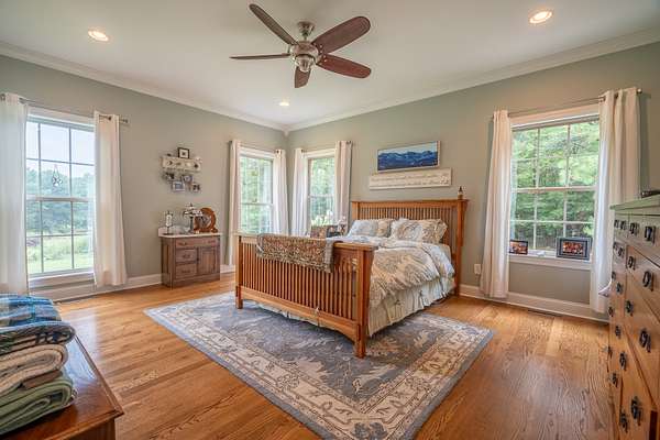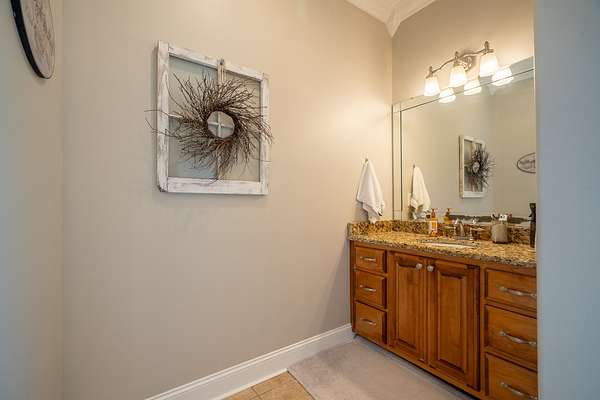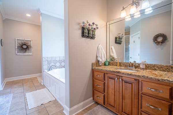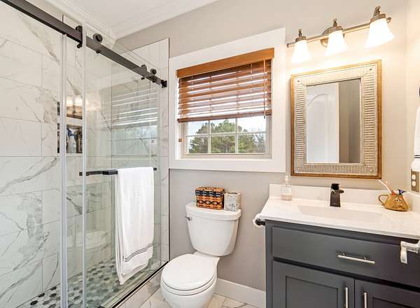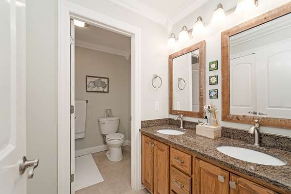 The main-level master suite is a true retreat, complete with a large master bath that includes his and her vanities, a walk-in shower, and a relaxing garden tub. A main floor guest bedroom offers comfort and privacy with a fully renovated en-suite bathroom--perfect for visitors or multi-generational living.