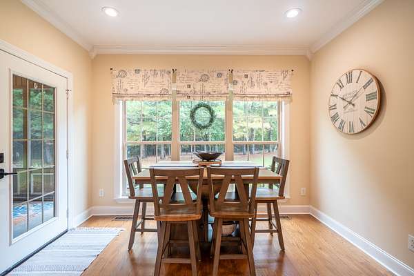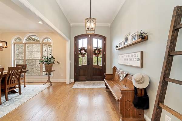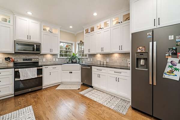 Step through the open entryway into a gorgeous living room featuring a cozy updated gas fireplace and direct access to the formal dining room. The heart of the home is the stunning recently remodeled kitchen, boasting an expansive island, abundant cabinetry, a generous walk-in pantry, and a luxurious blend of quartz and granite countertops. A charming coffee bar adds both function and flair, while a reverse osmosis water filtration system ensures clean, crisp water straight from the tap. Enjoy your morning coffee in the breakfast nook or relax on the screened-in back porch overlooking the peaceful, private backyard.
