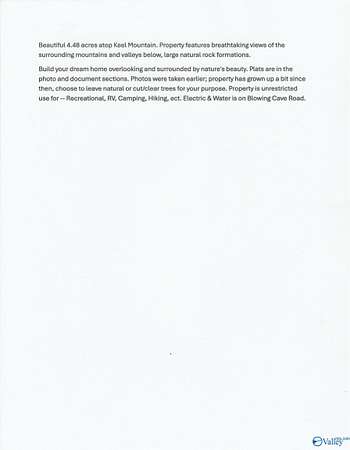 Beautiful 4.5 acres bluff property on the southern tip of Keel Mountain. Two properties-sold together(1.48 ac. & an adjoining 3 ac.) Rd., frontage at the top & bottom of Blowing Cave Rd. Wooded lot ,w/ potential views for miles in the south, east & west, once cleared. The property has utility services available. Total privacy for building a secluded retreat with mountain views. The potential of this property is unlimited w/ enough land for walking trails & being out in nature. Imagine a two story mountain home w/ a wrapping deck high above the ground. The hidden bluff is nearly straight down on the southern edge-provides a dramatic scene.
