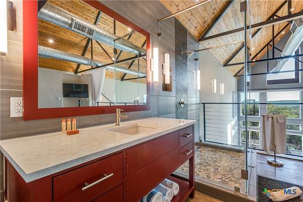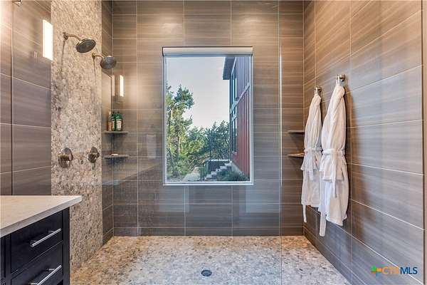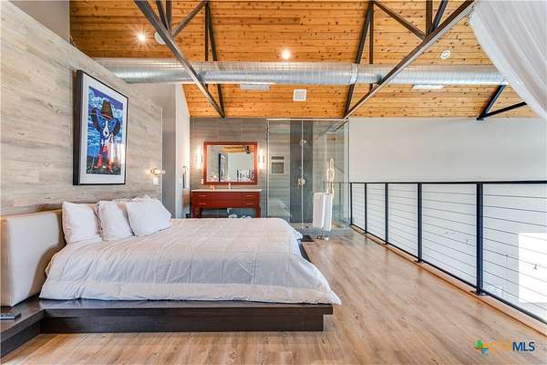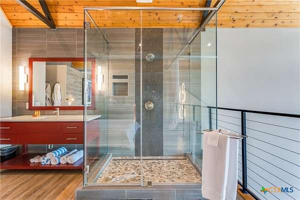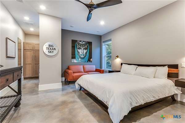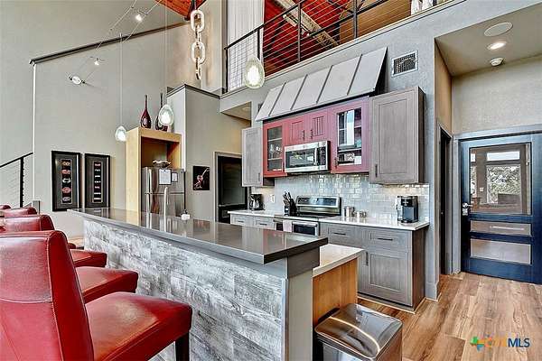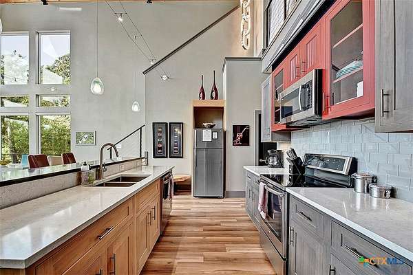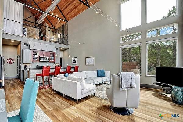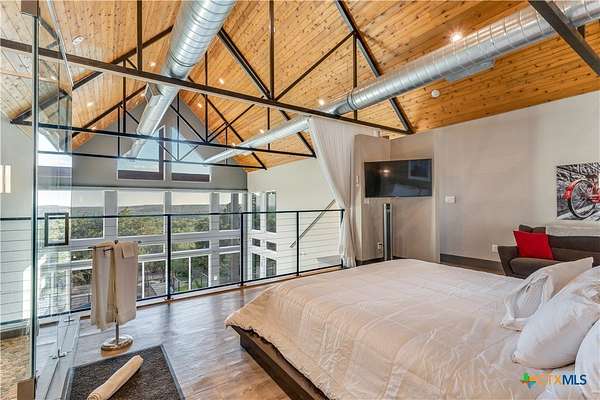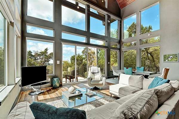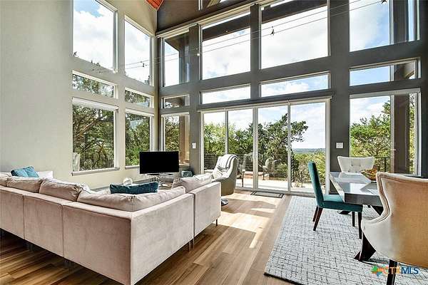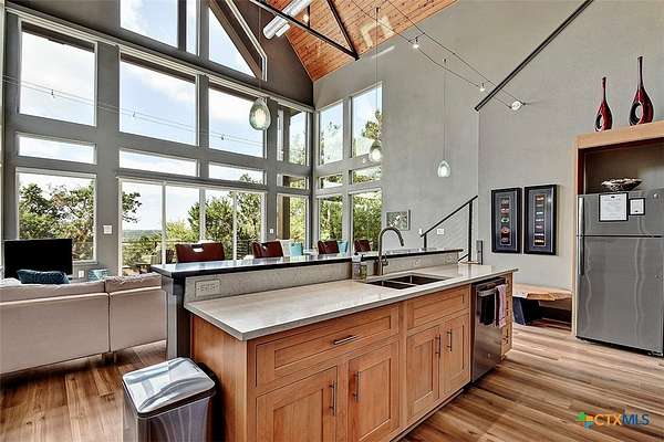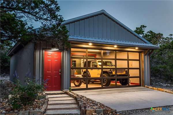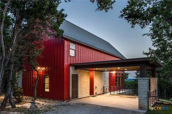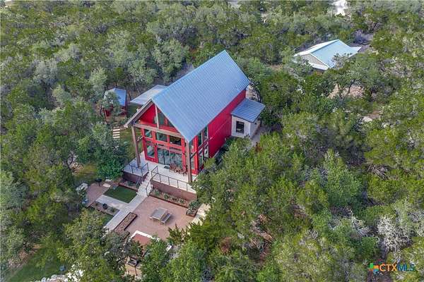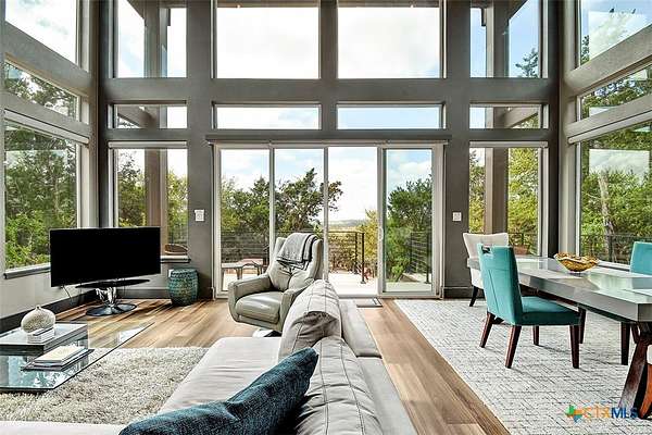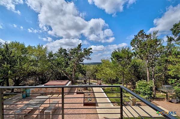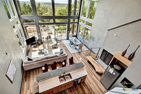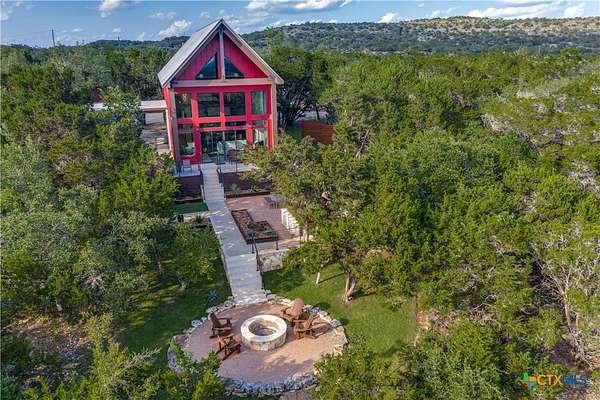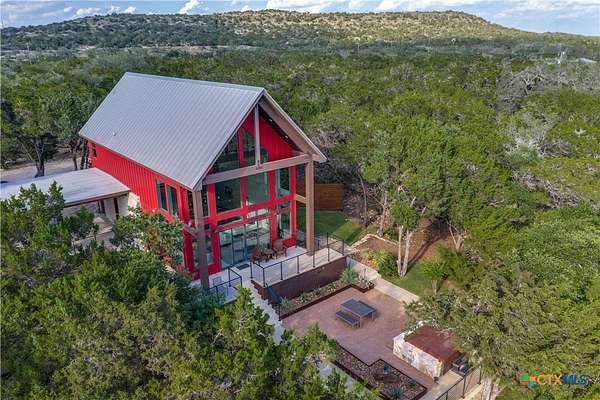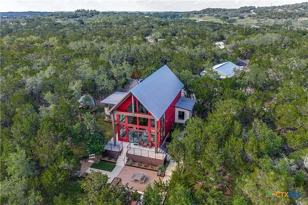Big Texan Sky has everything you could want in a Hill Country home. Step inside to a stunning view- the floor to ceiling windows overlook 8.5, AG exempt acres. The main home consists of 2 bedrooms and 2.5 baths. The architect and sellers put careful thought into the design aesthetics when creating this 'Hill Country Modern' home. With recent updates that include new flooring and a freshly painted interior. All furniture remains making this a convenient turnkey property. The style extends to the native landscaping and outdoor entertaining areas with a stone encased spa, perfect for relaxing to enjoy the sunset. Just below that sits a fire pit for hosting larger parties. The sellers have cleared a nature path for ease of exploration on the property. To call this 26' X 40' simply a garage, would be an understatement. Not only is there space for 3 cars, epoxy shield flooring, and an insulated and automatic glass garage door, but it also includes 22' X 14' living quarters appointed with a full bath with a spa like walk-in shower. This space includes a king size bed and full size couch. Your guest will not want to leave. Big Texan Sky has been operating as a vacation rental for several years with incredible reviews. This could continue as an income-producing property with potential to grow or work for anyone looking for a truly unique home surrounded by breathtaking views and peaceful quiet.