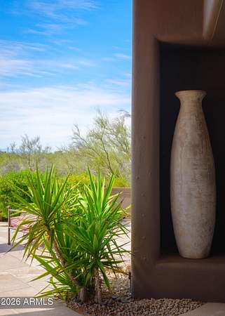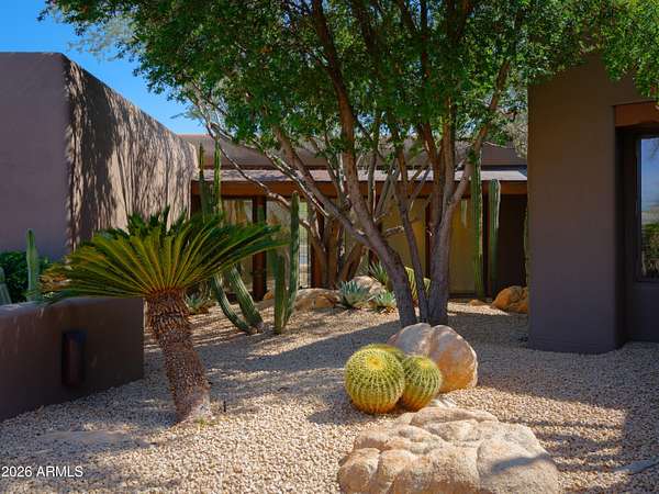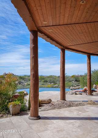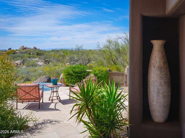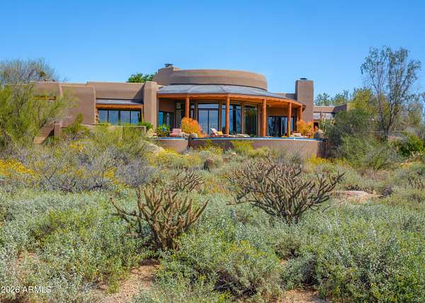 1.2 acres w/in the guard-gated community of The Boulders boasting Sunsets! Mature desert landscaping and a dramatic courtyard arrival to this Adobe-inspired masterpiece by renowned architect Terry Kilbane. Floor-to-ceiling curved glass and expansive patio doors capture sweeping desert vistas & sunsets from every room. Outdoor living is elevated by a negative-edge pool/spa overlooking Sonoran landscapes. An estate site that offers 3 BR + private office, 3.5 baths, split primary suite boasting breathtaking views. Guest BRs enjoy their own wing with ensuite baths, walk-in closets, patios & scenic outlooks. A grand entry flows seamlessly into the open living spaces. Formal dining room adorned with custom log accents & distinctive architectural niches. Timeless Private Estate w/ VIEWS Spanning 4,738 square feet, this residence offers 3 bedrooms plus a private office, 3.5 baths, and a thoughtfully designed split-primary floor plan. The primary suite is a secluded retreat with breathtaking views, while guest bedrooms two and three enjoy their own private wing, each with ensuite baths, walk-in closets, patios, and scenic outlooks. The Gourmet Island Kitchen is designed for both everyday living and entertaining, complete with granite countertops, Sub-Zero refrigeration, gas cooktop, double ovens, walk-in pantry with abundant storage, wet bar, ice maker, wine refrigerator, and refrigerated drawers. Breakfast nook can suit your lifestyle...furnish as your Eat-In Kitchen or Cozy Conversation area nestled by the fireplace. Desirable oversized three-car garage with workshop, offering ample space for vehicles, storage, and hobbies. Some additional features include copper enhancements at the rooftop and doorways, electric shades, high tech lighting system, generous sized bright laundry room with storage and sink. Attention to detail and enduring design that's truly impossible to replicate at this price point, this is a timeless desert estate that embodies privacy, architectural distinction and elevated Arizona living. About the Architect: Arizona architect Terry Kilbane is known for his exacting attention to detail and a design approach rooted in organic form and historical reference. Based in Carefree, Arizona, his work draws from the logic of place ~ land, climate, and material ~ resulting in buildings whose massing feels timeless and grounded. Rather than imposing on the site, Kilbane's designs appear to grow naturally from the landscape, blending careful craftsmanship with a deep respect for context. 1.3 Acre Vacant Lot (7841 E Sunflower Ct ~ Combined in offering of 7873 E Sunflower Ct) Visit BouldersClub website for more details regarding the two championship golf courses and membership. The Boulders amenities include Golf, the Spa, Tennis / Pickleball, Community Pools, Restaurants & Cafes, Fitness facility and more to enhance a healthy, active lifestyle in Arizona!