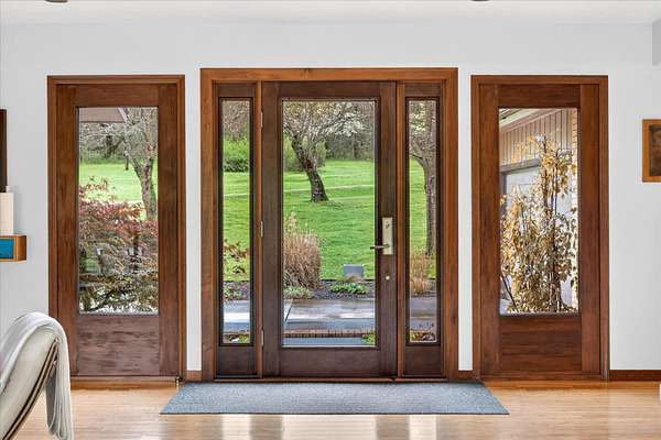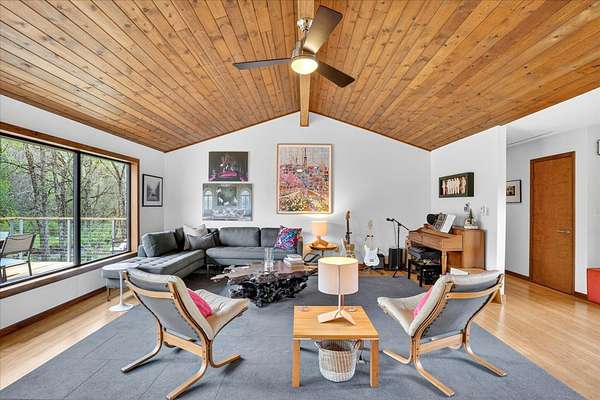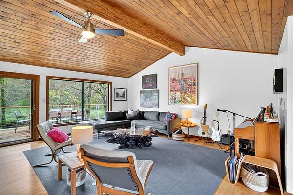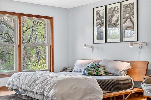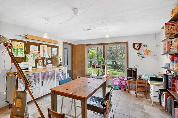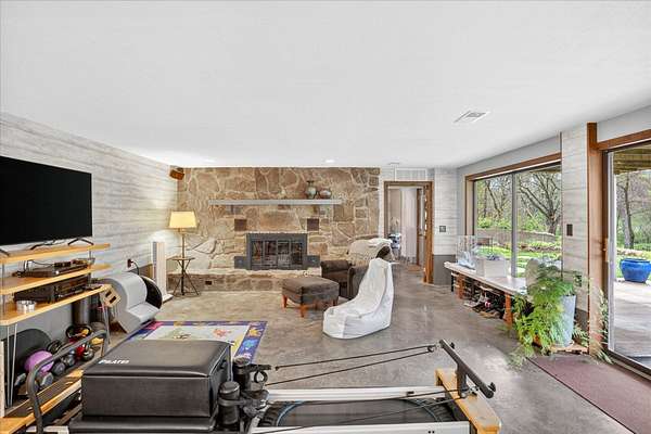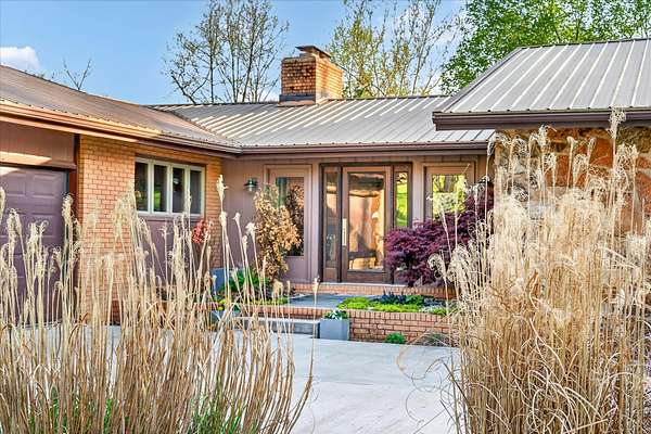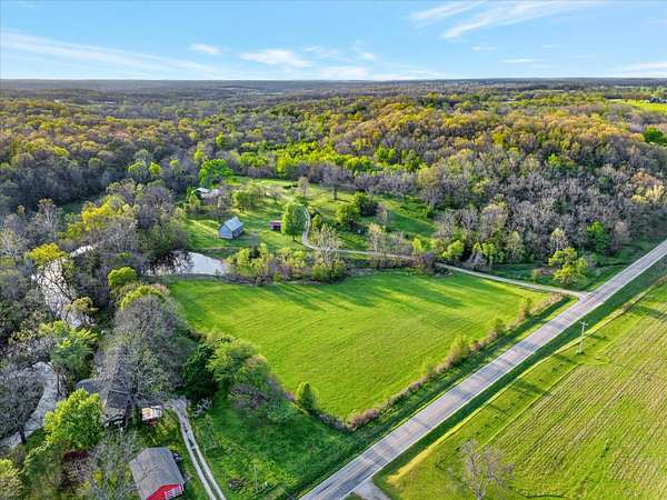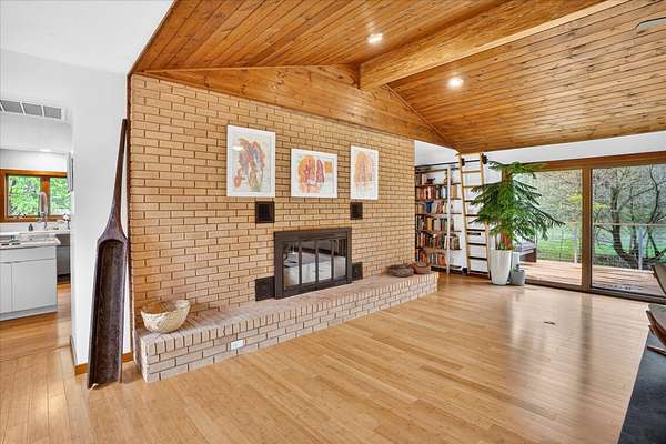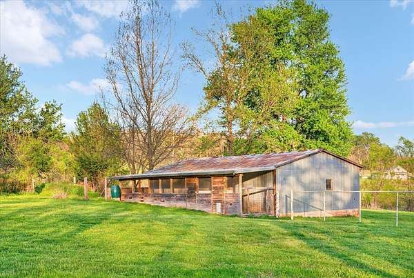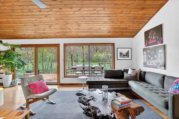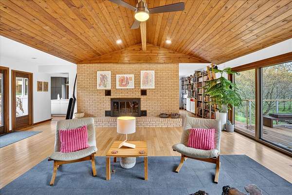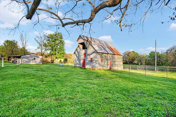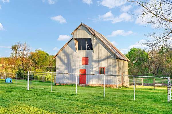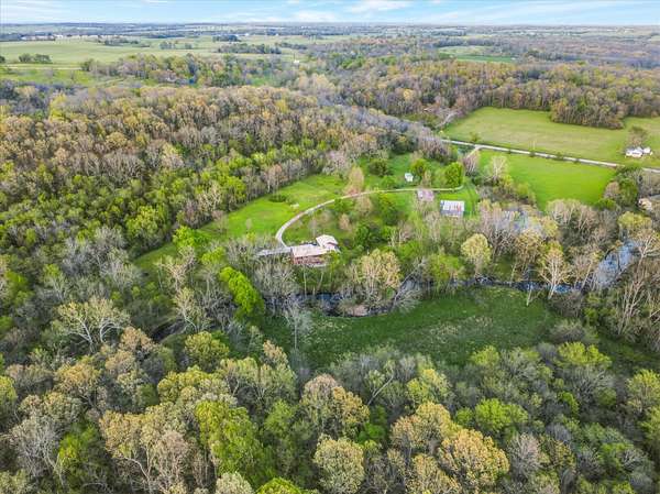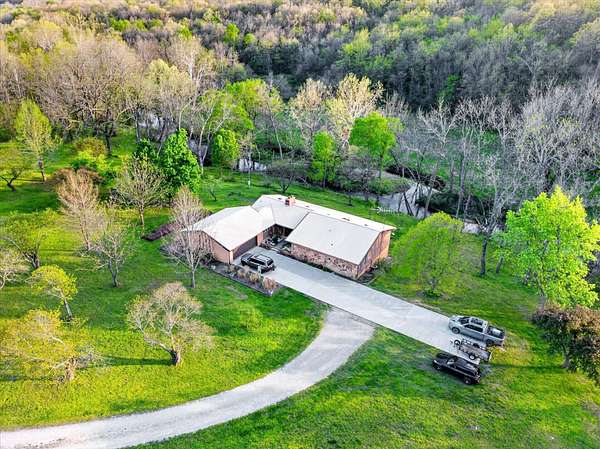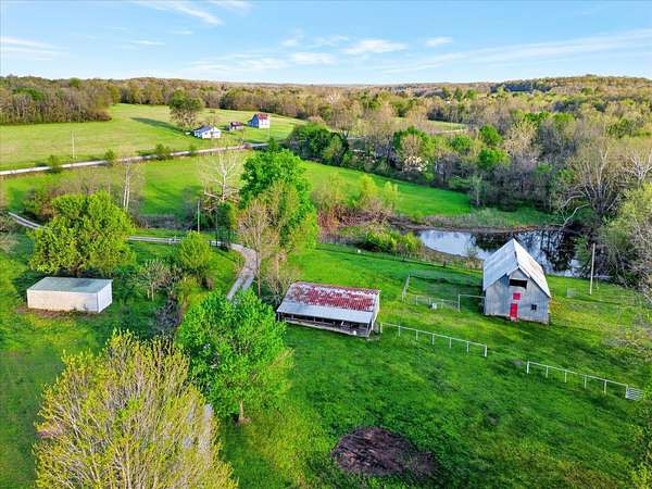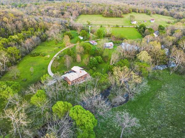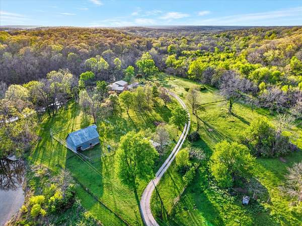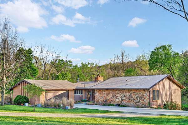 Set on just over 18 acres south of Halltown, this property offers a setting and design that immediately stand apart. From the moment you arrive, the combination of stone, warm wood tones, and surrounding landscape creates a quiet, tucked-away presence. Inside, the home leans into a mid-century modern influence with soaring wood ceilings, statement fireplaces, and walls of glass that pull in natural light and frame the views beyond. Thoughtful updates blend clean, modern finishes with the character that gives the home its warmth. The layout offers both function and flexibility, with a private primary suite upstairs alongside a guest bedroom and bath, while the lower level provides additional bedrooms or office space. The primary bath features imported Italian tile, adding a subtle layer of quality and design. A dedicated work room creates space for a home office, hobbies, or homeschooling without disrupting the home's flow. The kitchen anchors the main living area with an elevated, functional design, while the dining and living spaces feel connected yet defined, creating a natural place to gather. Outside, the setting continues with usable acreage, mature trees, and an all-weather creek that adds both movement and character, supported by numerous structural and landscaping improvements. The property is well-equipped for a variety of uses with two wells, one serving the home and one dedicated to the outbuildings, along with two electrical meters for added flexibility. A barn, chicken coop, and additional outbuilding further expand the possibilities for animals, projects, or simply enjoying the space, all just a short 20 minute drive from Springfield.