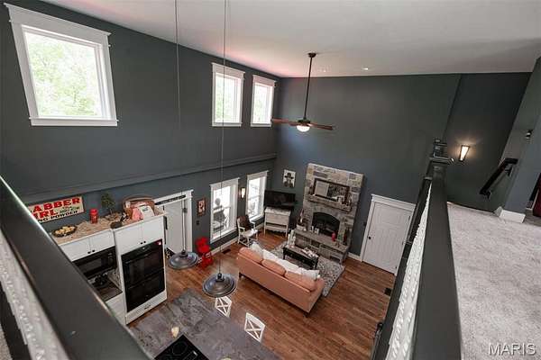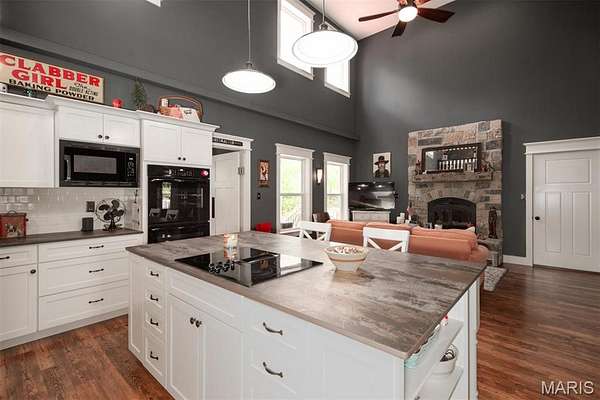 - Breakfast Bar, Custom Cabinetry, Double Vanity, Entrance Foyer, Fireplace, Kitchen Island, Lever Faucets, Open Floorplan, Security Lighting, Separate Dining, Solid Surface Countertop(s), Special Millwork, Tub, Walk-In Closet(s), Workshop/Hobby Area