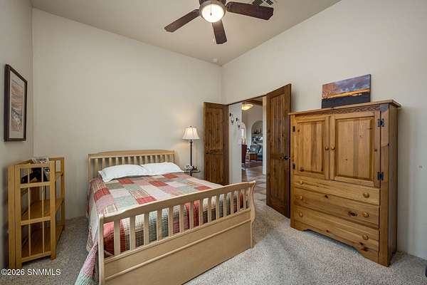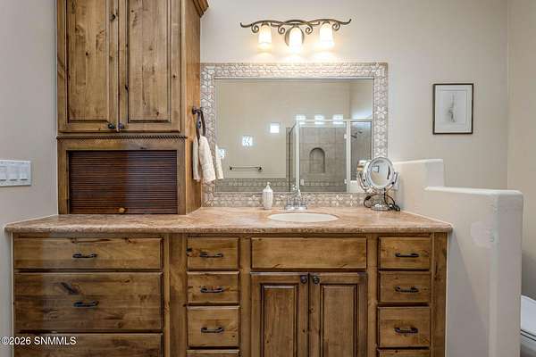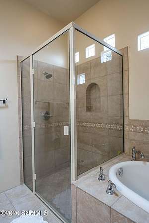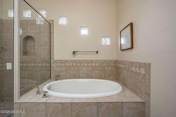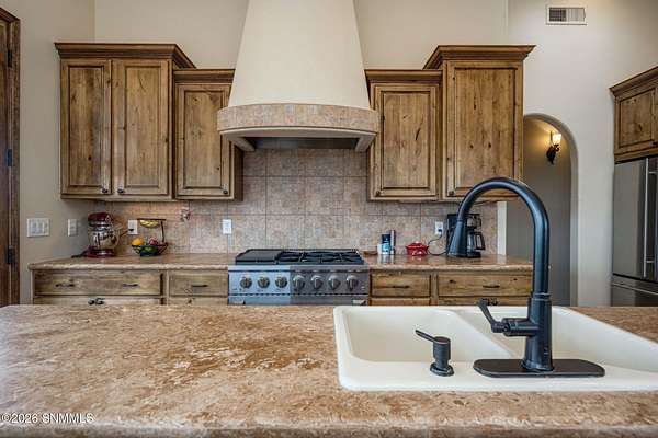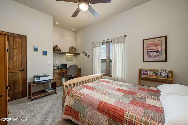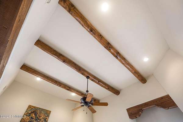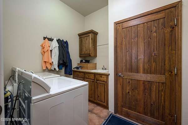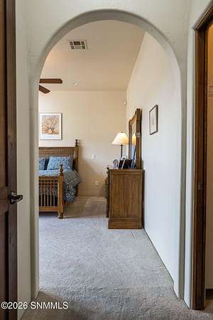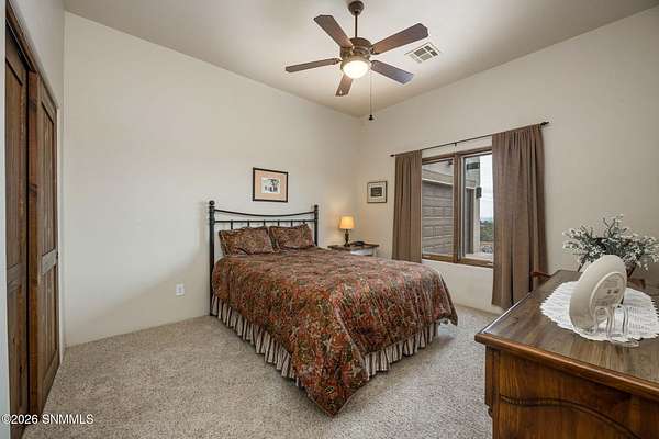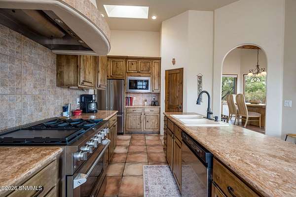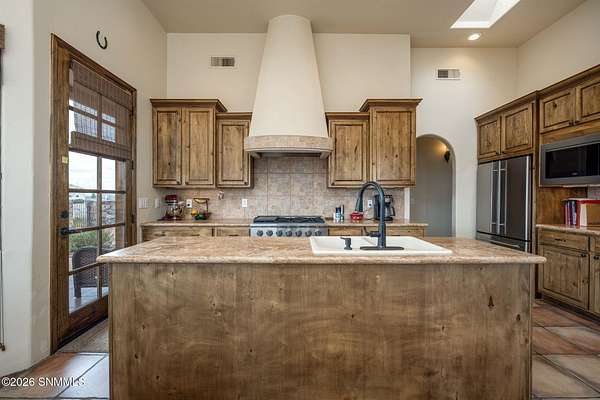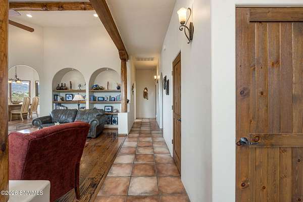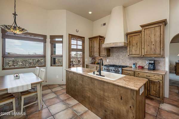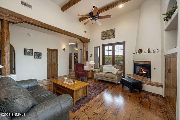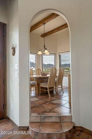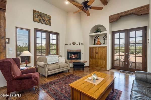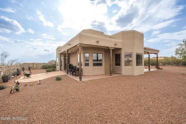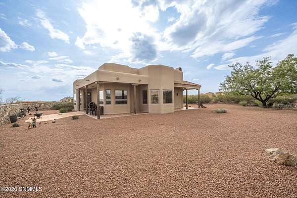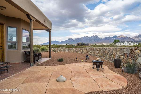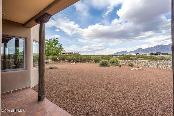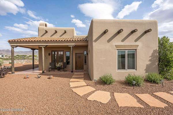 Experience authentic Santa Fe-style architecture on 2.36 acres, thoughtfully designed to capture the beauty of the surrounding desert and Organ Mountain views. From the moment you arrive, the tiled front porch and striking custom entry door set the tone for the craftsmanship found throughout. The living room is the crown jewel, featuring soaring ceilings, wood flooring, exposed wood beams, and rich Southwestern accents that define the space. Clerestory French doors in the living room and casement windows throughout fill the home with natural light. The formal dining area and primary suite both frame breathtaking mountain views and sunrises. Granite countertops in the kitchen and primary bath, along with custom wood doors, cabinetry, and unique Southwestern touches, add warmth throughout. The tiled porch areas offer multiple spaces to take in the beautiful landscape. Don't miss the opportunity to see this amazing property.