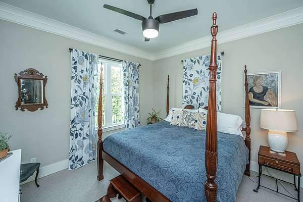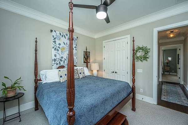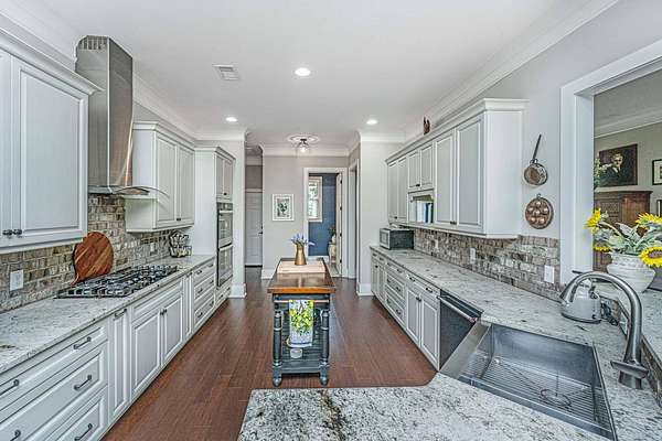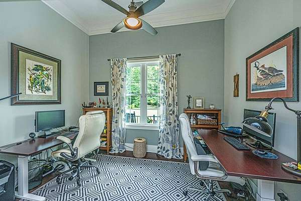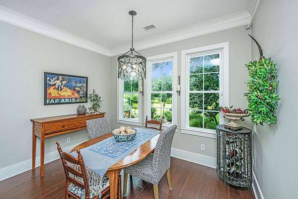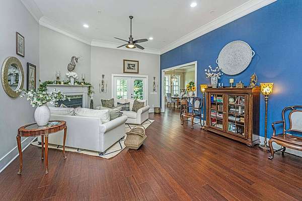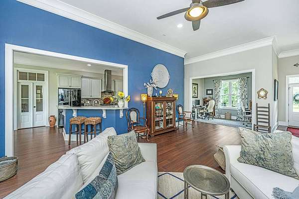 Refined retreat on 1.72 acres on a pond with mature landscape. Gorgeous European-inspired, custom home. Experience sweet sea breezes from the nearby Intracoastal Waterway outside and premium finishes and craftmanship thru out the interior. Boasting 10' and 12' ceilings w/crown moldings, 3 lg bdrm and 2.5 bas, beautiful foyer & great room centered on the gas fireplace w/antique surround and beautiful Italian tile. Hardwood floors, sophisticated kitchen w/granite countertops, custom millwork w/maximum storage, wall air fryer/oven combo, gas cook top, refrigerator, dishwasher, & microwave. The lg primary suite w/bedroom leading into your own spa-like bath area with waterfall-tiled, walk-in shower & separate spa tub, double sinks, and very roomy walk-in closet. Home also has an expansive finishes FROG, sizable laundry rm, and weather impact windows. All of this & fabulous, fun neighbors! Awendaw, a serene coastal town is a quick drive to Mount Pleasant, Charleston, & the beaches!