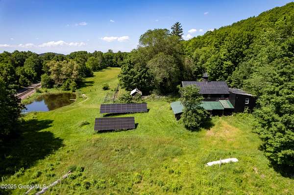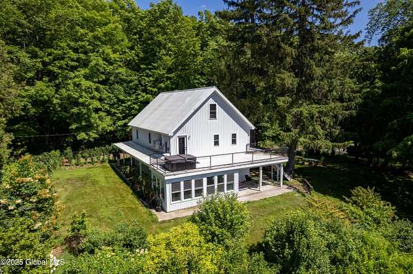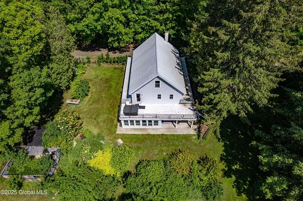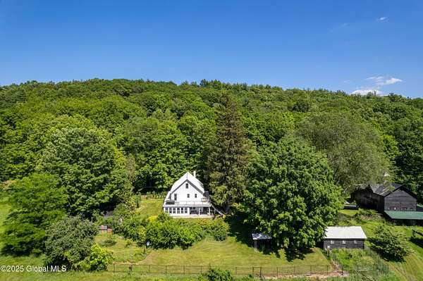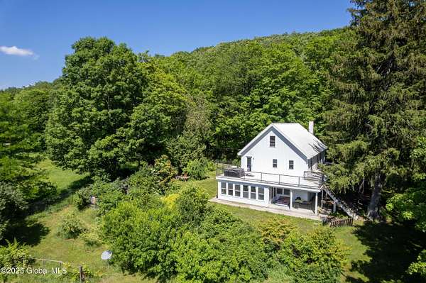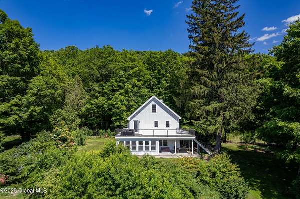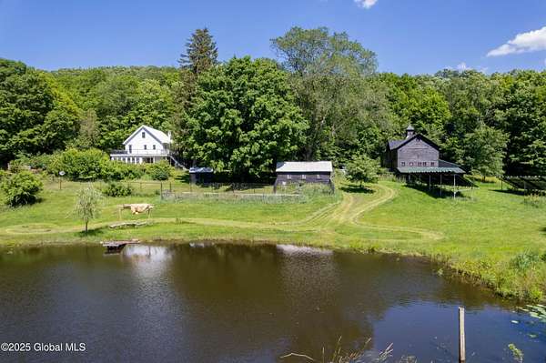Step back in time in renovated 1850's farmhouse, on expansive 163+ acre estate set in serene woods. A rare combination of historic charm & contemporary convenience featuring 4 bedrooms and 4.5 baths - designed during a down to studs renovation. 3rd floor suite with stand alone heating & cooling & a large wet room. Open concept kitchen flows into dining and living areas. Enjoy covered wrap porch or 2nd floor deck with views of lush oasis. Equestrian & hobby enthusiasts will delight in 2 story barn with water, septic, garage, horse stalls and 2nd floor loft - perfect for studio, workshop or private space. Outbuildings, ponds, and access to Kinderhook Creek. Multiple sites for building or subdivision. A country retreat minutes from local amenities and less than 3 hours from NYC & Boston!