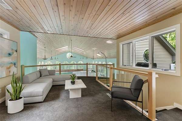 The standout feature is a 45×65 indoor pool wing with a heated in-ground pool, hot tub, sauna, full second kitchen, and bathroom—perfect for year-round enjoyment, short term rentals or extended stays. Very desirable floorplan with 3 bedrooms on upper level including the ultimate primary suite with attached office/nursery. High ceilings, hardwood and tile flooring, natural light, wonderful views, and 2 cozy fireplaces make this a spacious yet cozy home. Secondary primary suite is yet another bonus, particularly for multi-generational living.