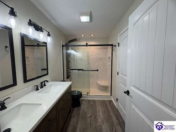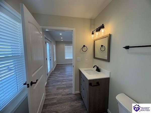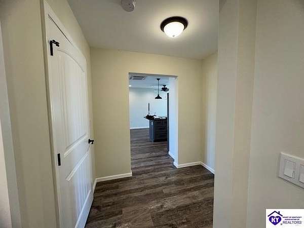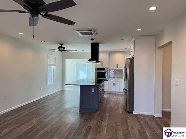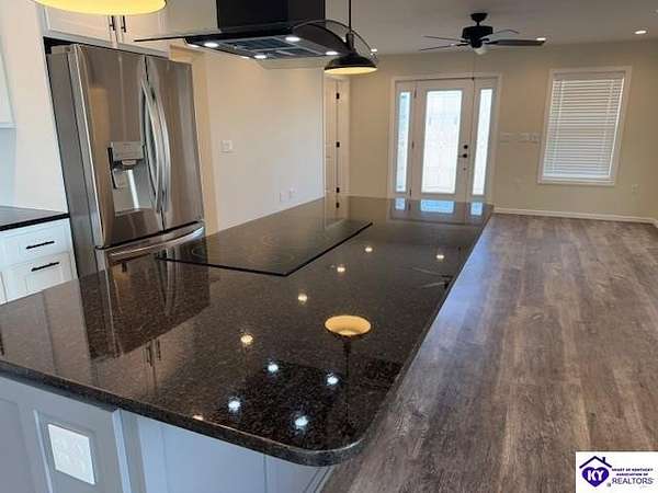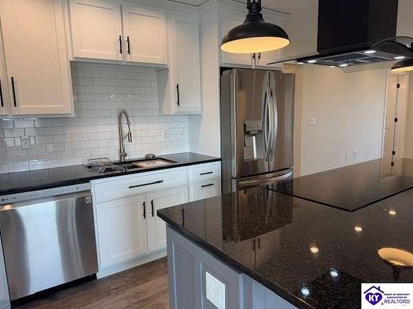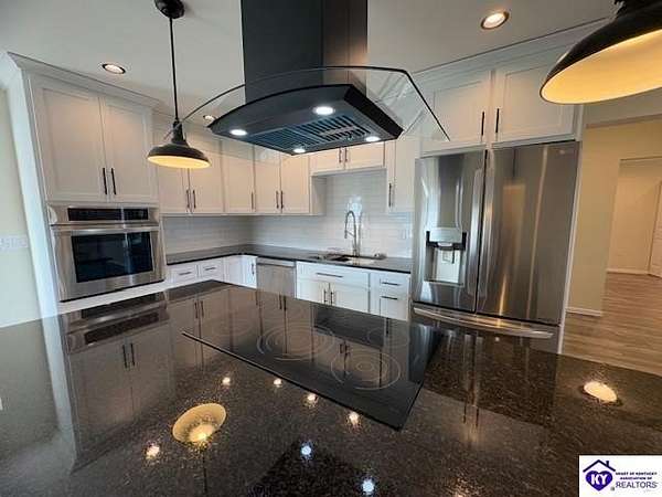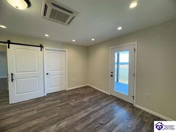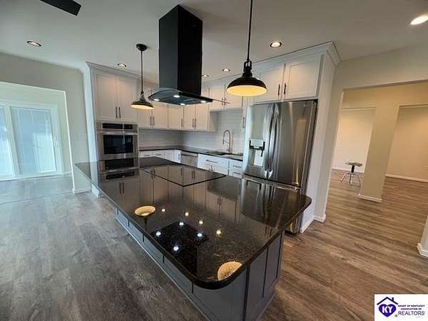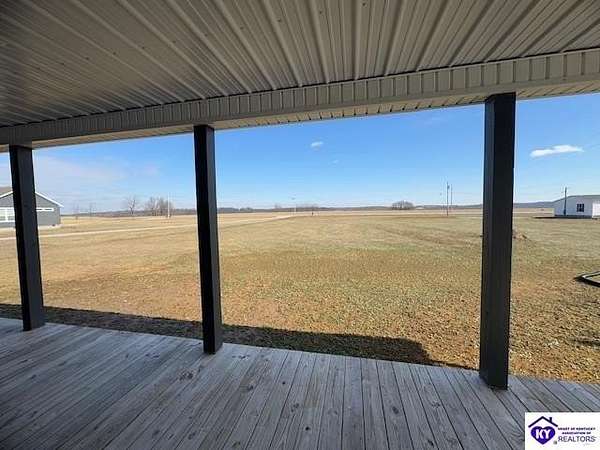 Lovely custom built home on 1.64 acres near Rough River Lake, offers you the convenience of living in country-like surroundings yet the appeal of lake life close by. 10 minutes from Hardinsburg, KY. Less than 1 hour to Owensboro and within 45 minutes to Fort Knox. Within 10-12 minutes you can be at Nick's Boat Dock and the Sometimes Grill, or Rough River State Park. Outdoor enthusiasts will love this location. This adorable custom home was built with love and consideration to details. A little over 1400 sq' with 2 bedrooms, 1.5 baths also gives the option to convert space to a 3rd bedroom. Details for senior living include a side ramp to carry groceries or furniture into the home from the oversized attached garage. The handicap width doors into each room are an added feature. This home is super insulated and with the twin mini split heat and air system, it gives the most modest utility bills to this home you can find. Totally electric but propane is an option to install should you want it. The washer/ dryer are in the large walk-in bedroom closet so you are not lugging laundry across the home. Off the back patio and from the sunroom, views of a neighbor's pond will give you afternoon enjoyment while some amazing sunrises can be viewed each day from the covered front porch or open living area. So much thought has gone into building this home. There are no HOA restrictions or fees. This home has a 50 amp RV hook up with water and septic hook up on the side of the property. Living this close to Rough River Lake you are bound to have family or friends who will want to take advantage of this great set up! The kitchen and bathrooms have thick granite countertops. Beautiful stainless LG appliances set the kitchen design as if snipped from a magazine photo. The black granite countertop overhang on the kitchen island invites many guests to cozy up. The island is a focal part of the kitchen adorned by the smooth cooktop and a drop range hood which accents the flair for glamour and lots of light. The stainless oven is conveniently located at the end of the large island. The large microwave is mounted under the island to make meal prep a breeze while preserving precious space on your countertops. You are bound to love the tall flexible sink faucet with the sprayer and a cutting board that is designed to set inside the sink for easy meal prepping. Who would not LOVE this kitchen? LG Mini Split unit for Heat and air.